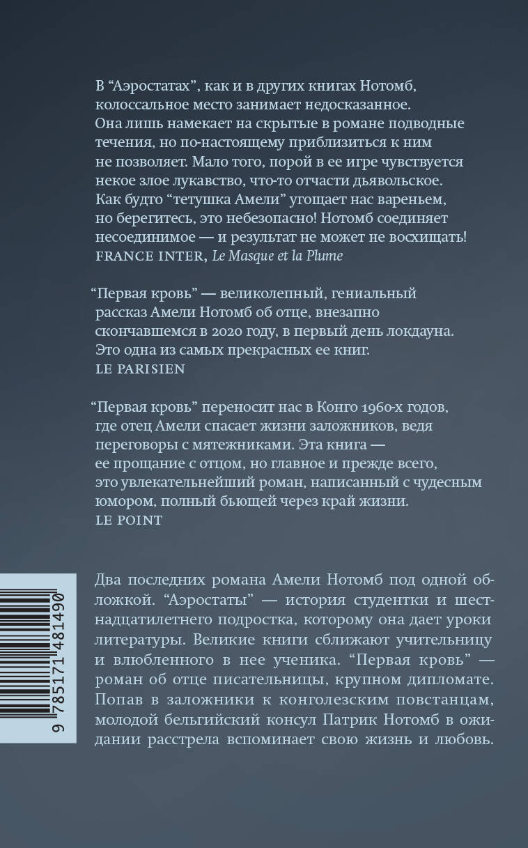 В этой книге под одной обложкой изданы два последних романа знаменитой бельгийской писательницы Амели Нотомб: "Аэростаты" и "Первая кровь". "Аэростаты" - история двух молодых людей, студентки второго курса и школьника старших классов. Ее нанимает репетитором его отец, чтобы избавить сына от дислексии. Чем это обернётся для молодых людей, и не пожалеет ли отец о сделанном выборе? Звучит как банальный зачин мелодрамы, но нет, Нотомб перевернет все ваши представления о подобных историях. "Первая кровь" - попытка Амели Нотомб посмотреть на мир глазами своего отца. Она от первого лица рассказывает, как Патрик Нотомб стоит перед расстрельным взводом конголезских повстанцев и вспоминает самые яркие моменты своей жизни. Мы следим за взрослением тихого мальчика и видим, как он постепенно становится тем, кто встанет под прицел ради спасения чужой жизни. Романы не объединяет ни сюжет, ни стилистика повествования, однако они стройно смотрятся вместе благодаря общей проблематике. Нотомб подходит к вечным темам с удивительно свежим взглядом. Смысл и ценность жизни, проблемы отцов и детей, что значит быть молодым и, в конце концов, что значит быть живым - все это в исполнении Нотомб приобретает невиданную до этого форму.| Издательство | Издательство "АСТ" |
