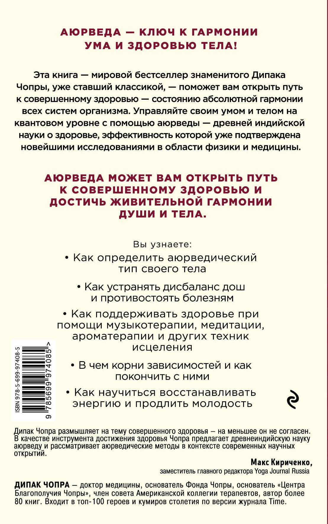 Это практическое руководство по использованию целительной силы ума от знаменитого Дипака Чопры рассказывает о том, как открыть себе путь к совершенному здоровью и достичь живительной гармонии души и тела. Книга была продана тиражом более 500 000 экземпляров, стала мировым бестселлером и уже успела стать классикой. В основе авторской методики - тысячелетняя мудрость Аюрведы, древней индийской медицины, и самые современные научные исследования в области медицины и квантовой физики. Она объясняет, как мысли, чувства и эмоции ведут нас к болезням или исцелению и позволяют воздействовать на наш организм на квантовом уровне. С помощью подробного теста определите свой аюрведический тип и узнайте, кто вы - легкая, беспокойная Вата; предприимчивая, рациональная Питта; спокойная, уравновешенная Капха - или смешанный тип. А дальше - следуйте аюрведической программе, адаптированной к вашим индивидуальным потребностям, которая включает в себя диету, физические упражнения и ежедневные практики. Эта программа поможет вам: - Достичь гармонии со своим аюрведическим типом. - Восстановить связь между телом и разумом. - Повернуть вспять процесс старения и исцелиться от болезней. - Начать жить в идеальном ритме и в единстве с природой. - Поддерживать здоровье при помощи музыкотерапии, медитации, ароматерапии и других техник исцеления. - Определить, в чем корни зависимостей и как покончить с ними ненавязчиво и без принуждения. «Дипак Чопра размышляет на тему совершенного здоровья - на меньшее он не согласен. В качестве инструмента достижения здоровья Чопра предлагает древнеиндийскую науку аюрведу и рассматривает аюрведические методы в контексте современных научных открытий». - Макс Кириченко, заместитель главного редактора Yoga Journal Russia Дипак Чопра - доктор медицины, основатель Фонда Чопры, основатель «Центра Благополучия Чопры», член совета Американской коллегии терапевтов, автор более 80 книг. Входит в топ-100 героев и кумиров столетия по версии журнала Time.