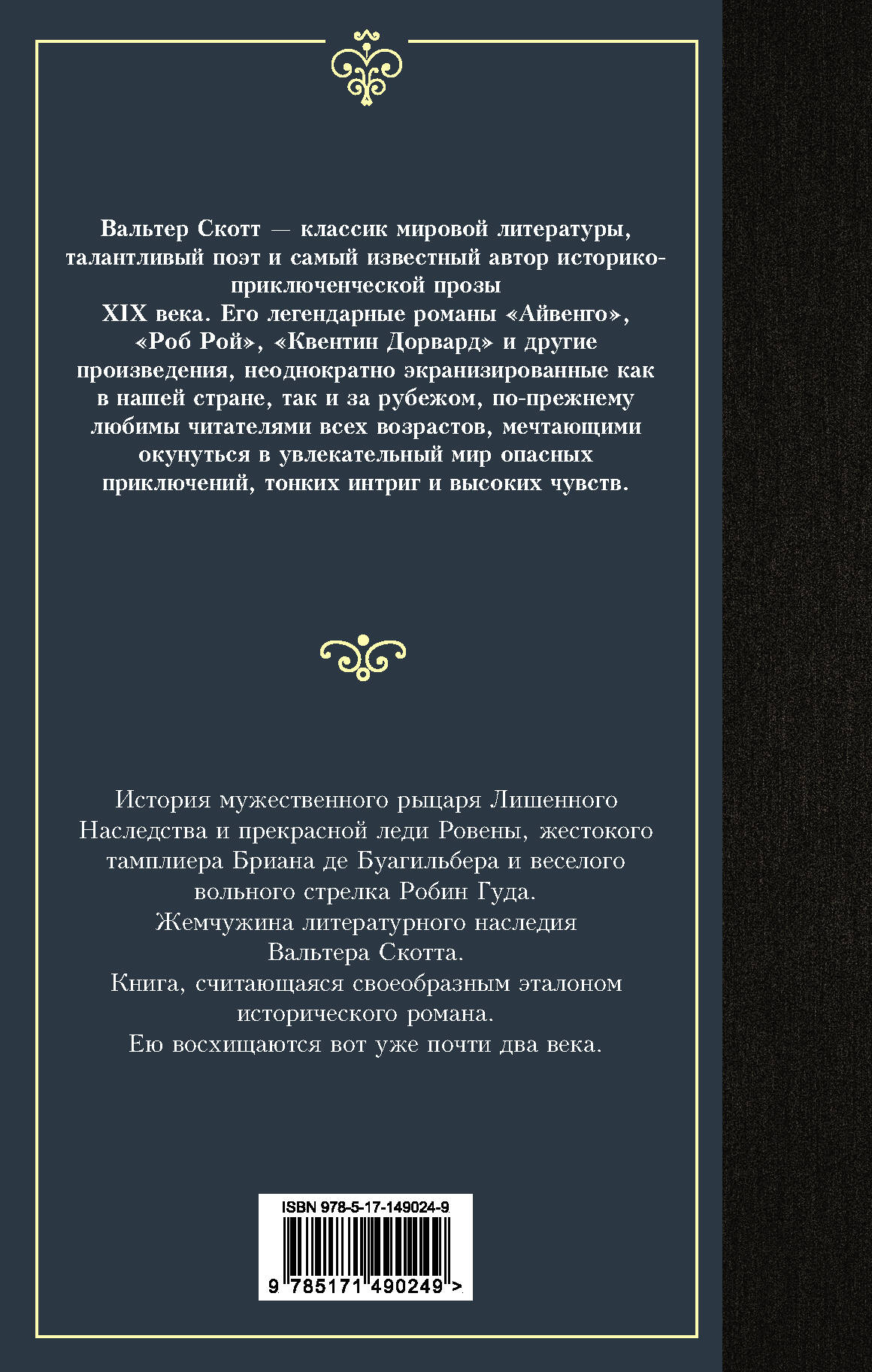 История мужественного рыцаря Лишенного Наследства и прекрасной леди Ровены, жестокого тамплиера Бриана де Буагильбера и веселого вольного стрелка Робин Гуда. Жемчужина литературного наследия Вальтера Скотта. Книга, считающаяся своеобразным эталоном исторического романа. Ею восхищаются вот уже почти два века.