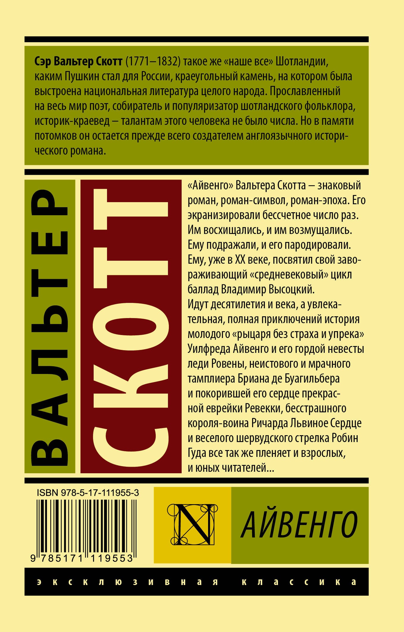 "Айвенго" Вальтера Скотта - знаковый роман, роман-символ, роман-эпоха. Его экранизировали бессчетное число раз. Им восхищались и ему возмущались. Ему подражали и его пародировали. Ему, уже в ХХ веке, посвятил свой завораживающий "средневековый" цикл баллад Владимир Высоцкий. Идут десятилетия и века, а увлекательная, полная приключений история молодого "рыцаря без страха и упрека" Уилфреда Айвенго и его гордой невесты леди Ровены, неистового и мрачного тамплиера Бриана де Буагильбера и покорившей его сердце прекрасной еврейки Ревекки, бесстрашного короля-воина Ричарда Львиное Сердце и веселого шервудского стрелка Робин Гуда все так же пленяет и взрослых, и юных читателей…| Издательство | ИЗДАТЕЛЬСТВО "АСТ" |