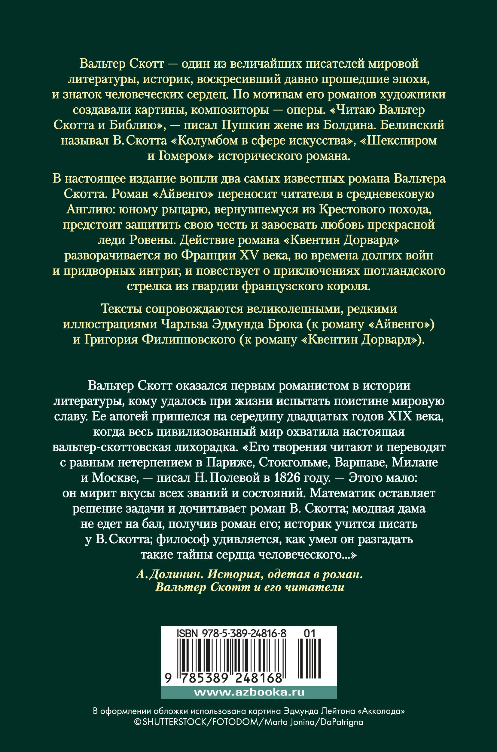 Вальтер Скотт - один из величайших писателей мировой литературы, историк, воскресивший давно прошедшие эпохи, и знаток человеческих сердец. По мотивам его романов художники создавали картины, композиторы - оперы. "Читаю Вальтер Скотта и Библию", - писал Пушкин жене из Болдина. Белинский называл В. Скотта "Колумбом в сфере искусства", "Шекспиром и Гомером" исторического романа. В настоящее издание вошли два самых известных романа Вальтера Скотта. Роман "Айвенго" переносит читателя в средневековую Англию: юному рыцарю, вернувшемуся из Крестового похода, предстоит защитить свою честь и завоевать любовь прекрасной леди Ровены. Действие романа "Квентин Дорвард" разворачивается во Франции XV века, во времена долгих войн и придворных интриг, и повествует о приключениях шотландского стрелка из гвардии французского короля. Тексты сопровождаются великолепными, редкими иллюстрациями Чарльза Эдмунда Брока (к роману "Айвенго") и Григория Филипповского (к роману "Квентин Дорвард").