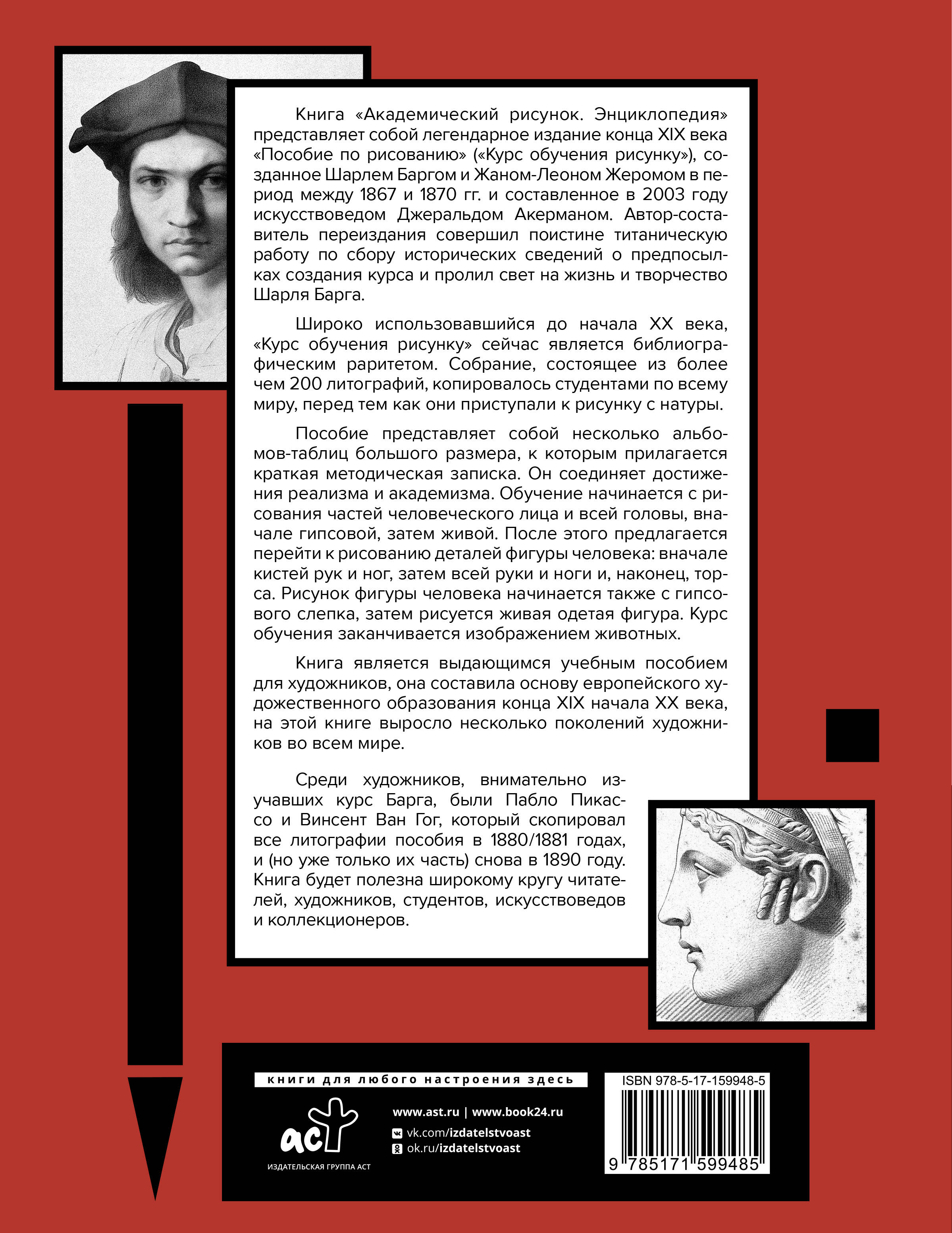 Книга "Академический рисунок" представляет собой легендарное издание конца XIX века "Пособие по рисованию" ("Курс обучения рисунку"), созданное Шарлем Баргом и Жаном-Леоном Жеромом в период между 1867 и 1870 гг. и составленное в 2003 году искусствоведом Джеральдом Акерманом. Автор-составитель переиздания совершил поистине титаническую работу по сбору исторических сведений о предпосылках создания курса и пролил свет на жизнь и творчество Шарля Барга. Широко использовавшийся до начала XX века, "Курс обучения рисунку" сейчас является библиографическим раритетом. Собрание, состоящее из более чем 200 литографий, копировалось студентами по всему миру, перед тем как они приступали к рисунку с натуры. Пособие представляет собой несколько альбомов-таблиц большого размера, к которым прилагается краткая методическая записка. Он соединяет достижения реализма и академизма. Обучение начинается с рисования частей человеческого лица и всей головы, вначале гипсовой, затем живой. После этого предлагается перейти к рисованию деталей фигуры человека: вначале кистей рук и ног, затем всей руки и ноги и, наконец, торса. Рисунок фигуры человека начинается также с гипсового слепка, затем рисуется живая одетая фигура. Курс обучения заканчивается изображением животных. Книга является выдающимся учебным пособием для художников, она составила основу европейского художественного образования конца XIX начала XX века, на этой книге выросло несколько поколений художников во всем мире. Среди художников, внимательно изучавших курс Барга, были Пабло Пикассо и Винсент Ван Гог, который скопировал все литографии пособия в 1880/1881 годах, и (но уже только их часть) снова в 1890 году. Книга будет полезна широкому кругу читателей, художников, студентов, искусствоведов и коллекционеров.| Издательство | Издательство "АСТ" |