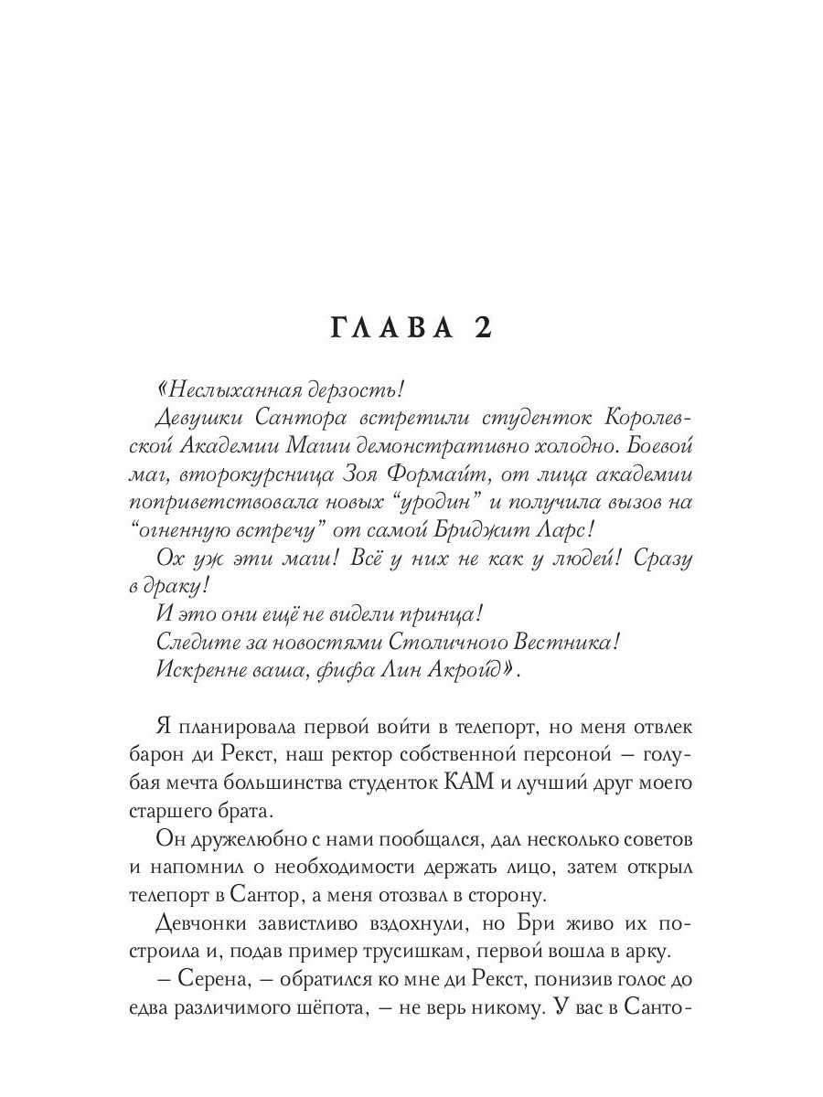 «Скандал! Его высочество поступил на боевой факультет академии Сантор. Красавицы-аристократки шокированы и, спешно пакуя чемоданы, отбывают из Королевской академии магии. Ворота Сантора закроются завтра в полдень. Смогут ли прекрасные леди справиться с ненавистью к "академии уродин" и надеть брюки ради возможности через три года примерить корону? Следите за новостями Столичного Вестника! Искренне ваша, фифа Лин Акройд».| Издательство | Т8 RUGRAM |