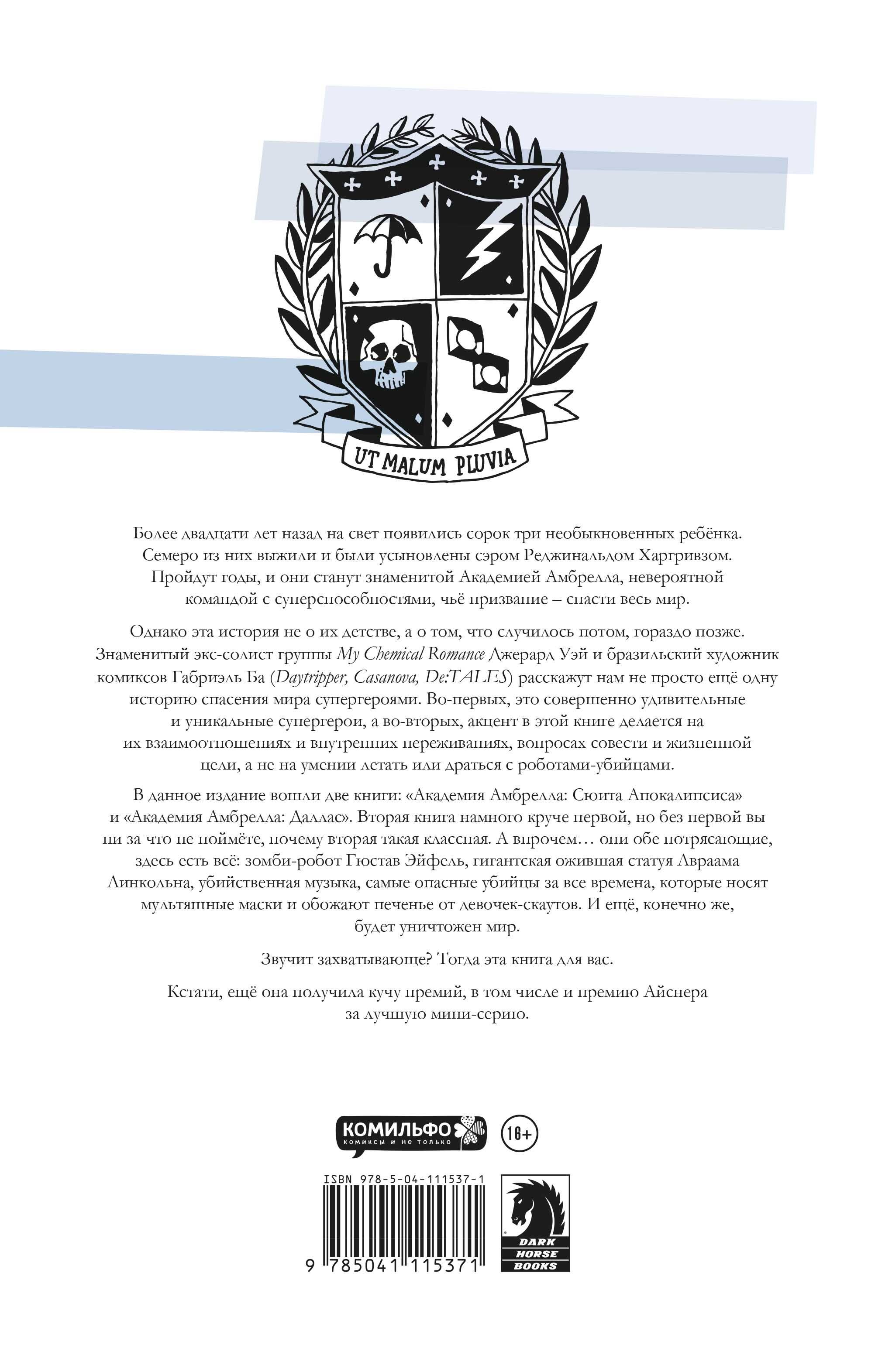 Более двадцати лет назад на свет появились сорок три необыкновенных ребёнка. Семеро из них выжили и были усыновлены сэром Реджинальдом Харгривзом. Пройдут годы, и они станут знаменитой Академией Амбрелла, невероятной командой с суперспособностями, чьё призвание - спасти весь мир. Однако эта история не о их детстве, а о том, что случилось потом, гораздо позже. Знаменитый экс-солист группы My Chemical Romance Джерард Уэй и бразильский художник комиксов Габриэль Ба (Daytripper, Casanova, De:TALES) расскажут нам не просто ещё одну историю спасения мира супергероями. Во-первых, это совершенно удивительные и уникальные супергерои, а во-вторых, акцент в этой книге делается на их взаимоотношениях и внутренних переживаниях, вопросах совести и жизненной цели, а не на умении летать или драться с роботами-убийцами. В данное издание вошли две книги: "Академия Амбрелла: Сюита Апокалипсиса" и "Академия Амбрелла: Даллас". Вторая книга намного круче первой, но без первой вы ни за что не поймёте, почему вторая такая классная. А впрочем… они обе потрясающие, здесь есть всё: зомби-робот Гюстав Эйфель, гигантская ожившая статуя Авраама Линкольна, убийственная музыка, самые опасные убийцы за все времена, которые носят мультяшные маски и обожают печенье от девочек-скаутов. И ещё, конечно же, будет уничтожен мир. Звучит захватывающе? Тогда эта книга для вас. Кстати, ещё она получила кучу премий, в том числе и премию Айснера за лучшую мини-серию.| Издательство | ООО "Издательство "Эксмо" |