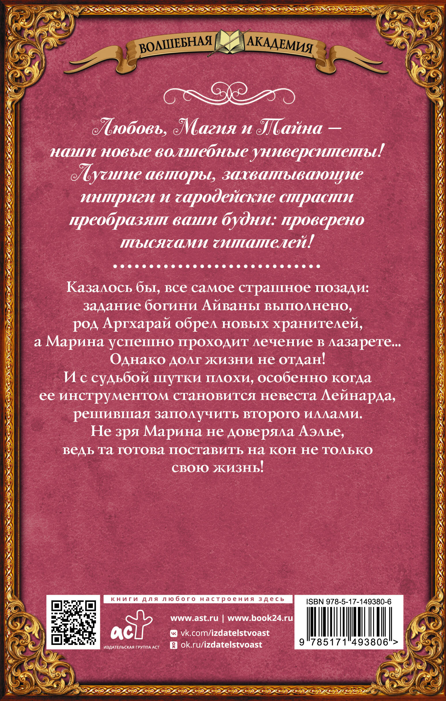 Казалось бы, все самое страшное позади: задание богини Айваны выполнено, род Аргхарай обрел новых хранителей, а Марина успешно проходит лечение в лазарете... Однако долг жизни не отдан! И с судьбой шутки плохи, особенно когда ее инструментом становится невеста Лейнарда, решившая заполучить второго иллами. Не зря Марина не доверяла Аэлье, ведь та готова поставить на кон не только свою жизнь!| Издательство | Издательство "АСТ" |