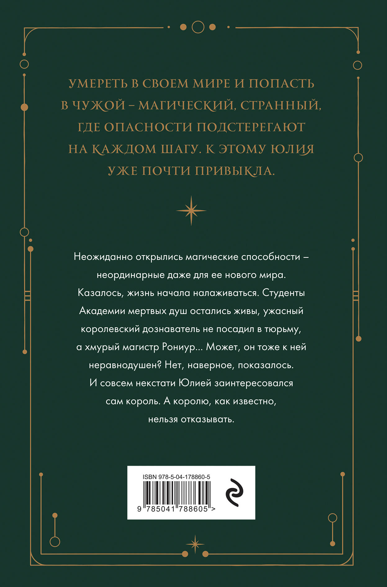 Умереть в своем мире и попасть в чужой - магический, странный, где опасности подстерегают на каждом шагу. К этому Юлия уже почти привыкла. Неожиданно открылись магические способности - неординарные даже для ее нового мира. Казалось, жизнь начала налаживаться. Студенты Академии мертвых душ остались живы, ужасный королевский дознаватель не посадил в тюрьму, а хмурый магистр Рониур... Может, он тоже к ней неравнодушен? Нет, наверное, показалось. И совсем некстати Юлией заинтересовался сам король. А королю, как известно, нельзя отказывать...| Издательство | ООО "Издательство "Эксмо" |