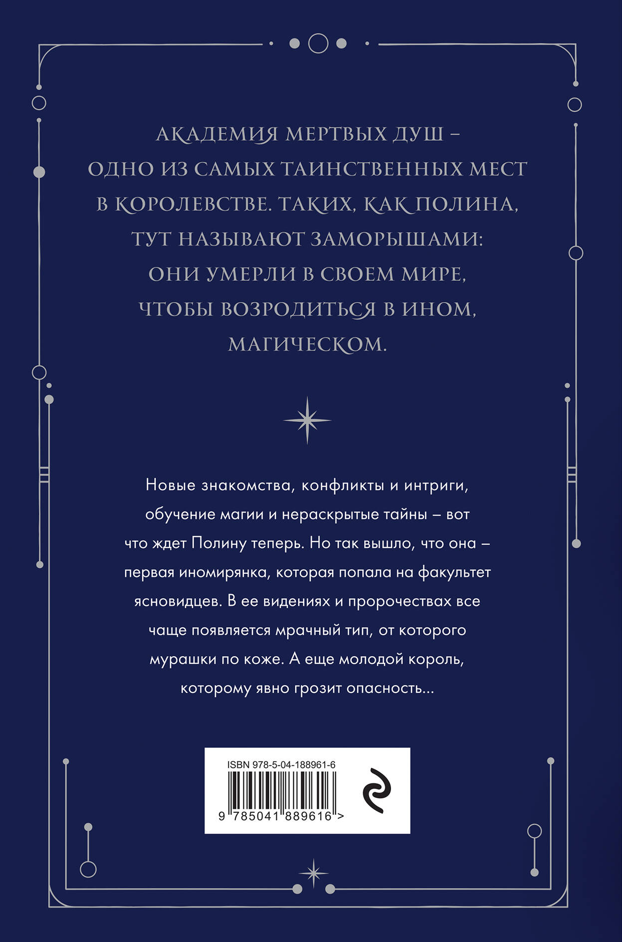 Третья книга в серии «Академия мертвых душ». Новые персонажи и магические факультеты. Бестселлер ЛитРес: более 16 000 прочтений, свыше 4700 высоких оценок. Академия по-прежнему принимает студентов из нашего мира. Цена поступления для каждого новичка высока: его собственная жизнь. Прогулка по ночному городу заканчивается для Полины трагически. Но смерть - это не конец, а только начало. Полине предстоит учиться на факультете ясновидцев, разбираться со сложными интригами и мучиться кошмарами, которые, как и положено, оказываются провидческими. Только как предупредить об опасности молодого короля, который совершенно не желает ее слушать?| Издательство | ООО "Издательство "Эксмо" |
