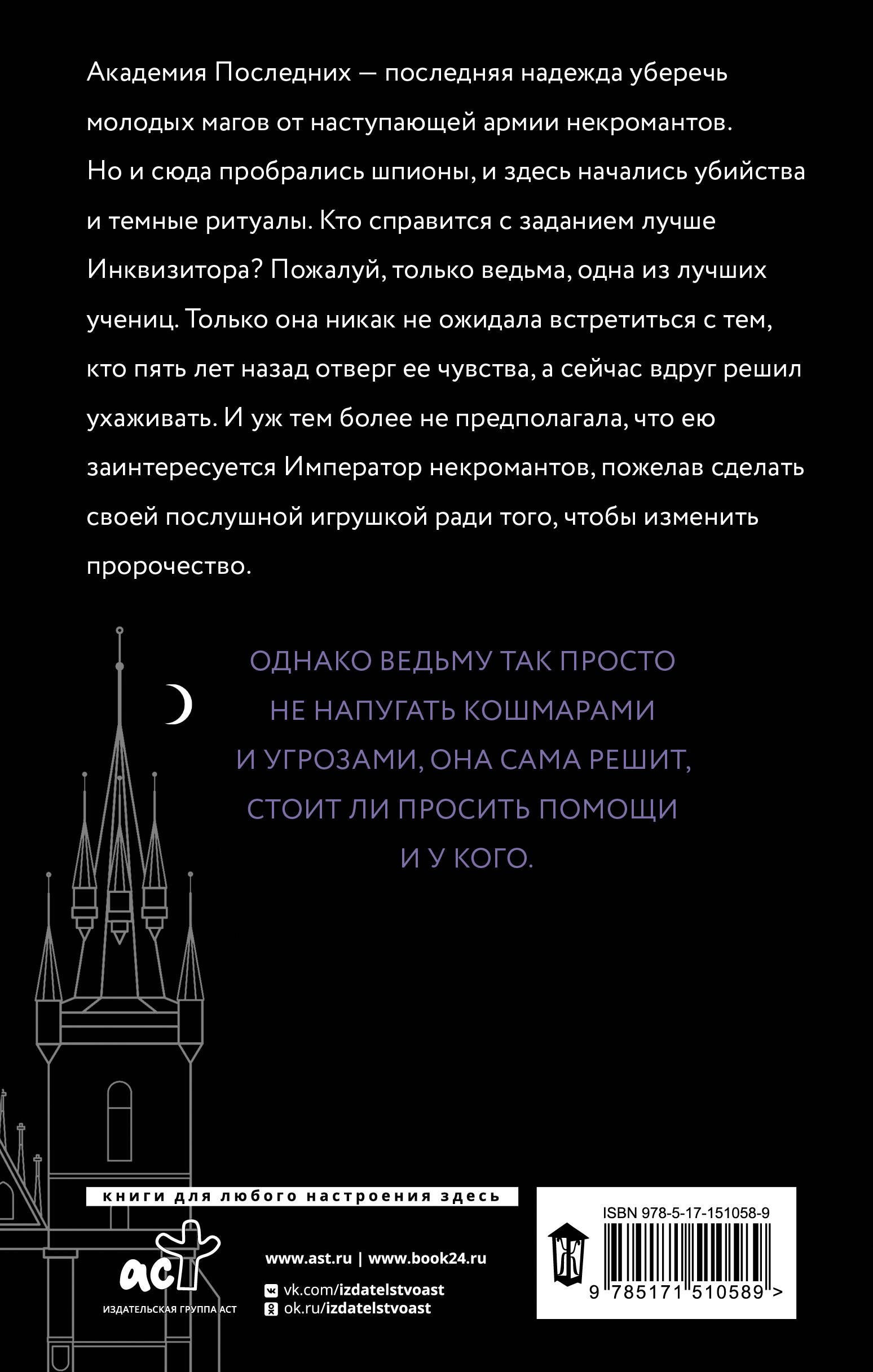 Академия Последних - последняя надежда уберечь молодых магов от наступающей армии некромантов. Но и сюда пробрались шпионы, и здесь начались убийства и темные ритуалы. Кто справится с заданием лучше Инквизитора? Пожалуй, только ведьма, одна из лучших учениц. Только она никак не ожидала встретиться с тем, кто пять лет назад отверг ее чувства, а сейчас вдруг решил ухаживать. И уж тем более не предполагала, что ею заинтересуется Император некромантов, пожелав сделать своей послушной игрушкой ради того, чтобы изменить пророчество. Однако ведьму так просто не напугать кошмарами и угрозами, она сама решит, стоит ли просить помощи и у кого.| Издательство | ИЗДАТЕЛЬСТВО "АСТ" |