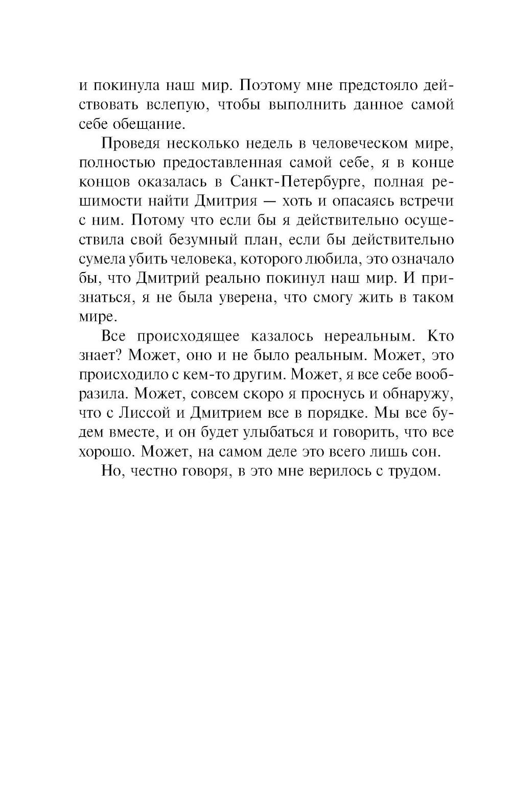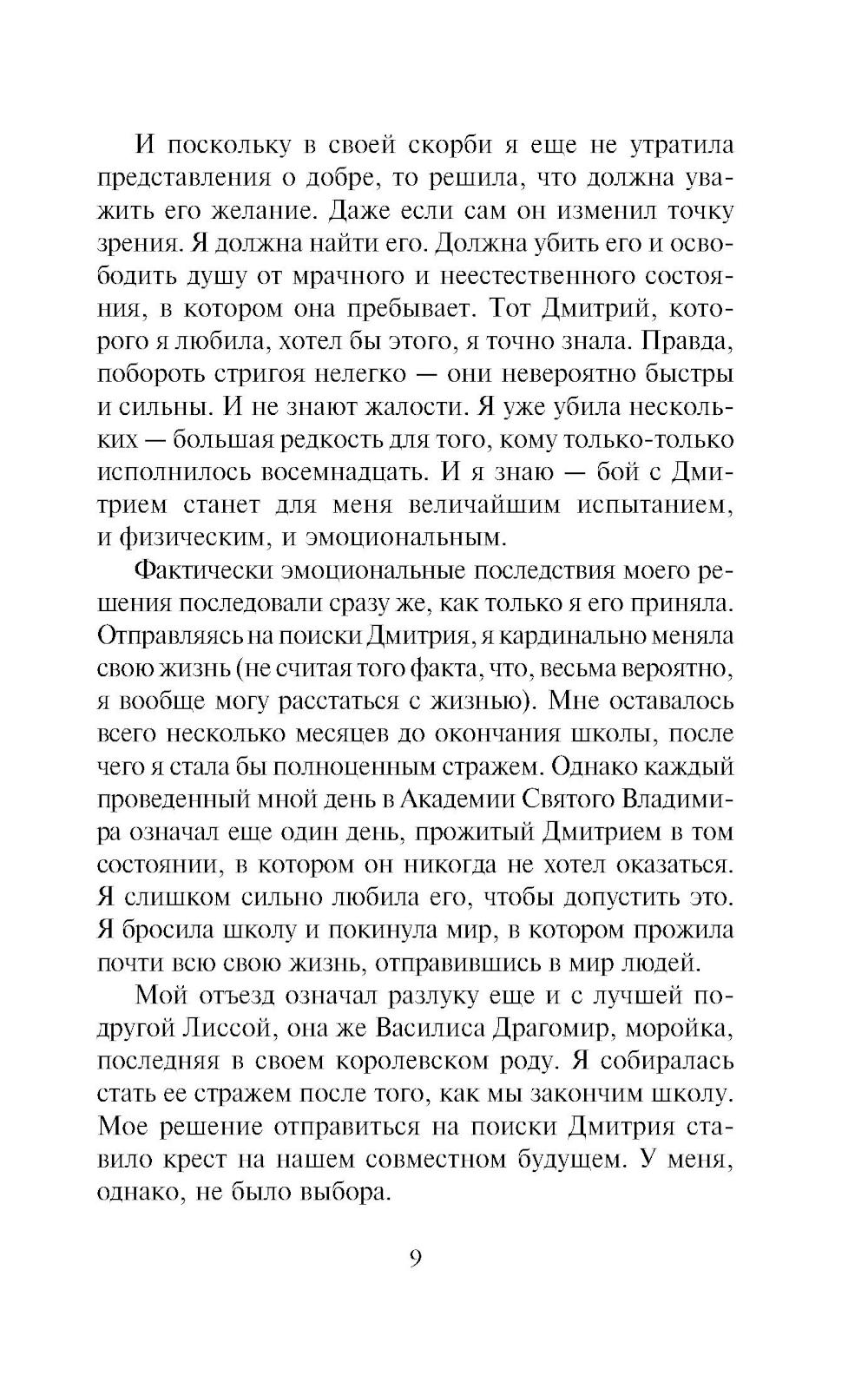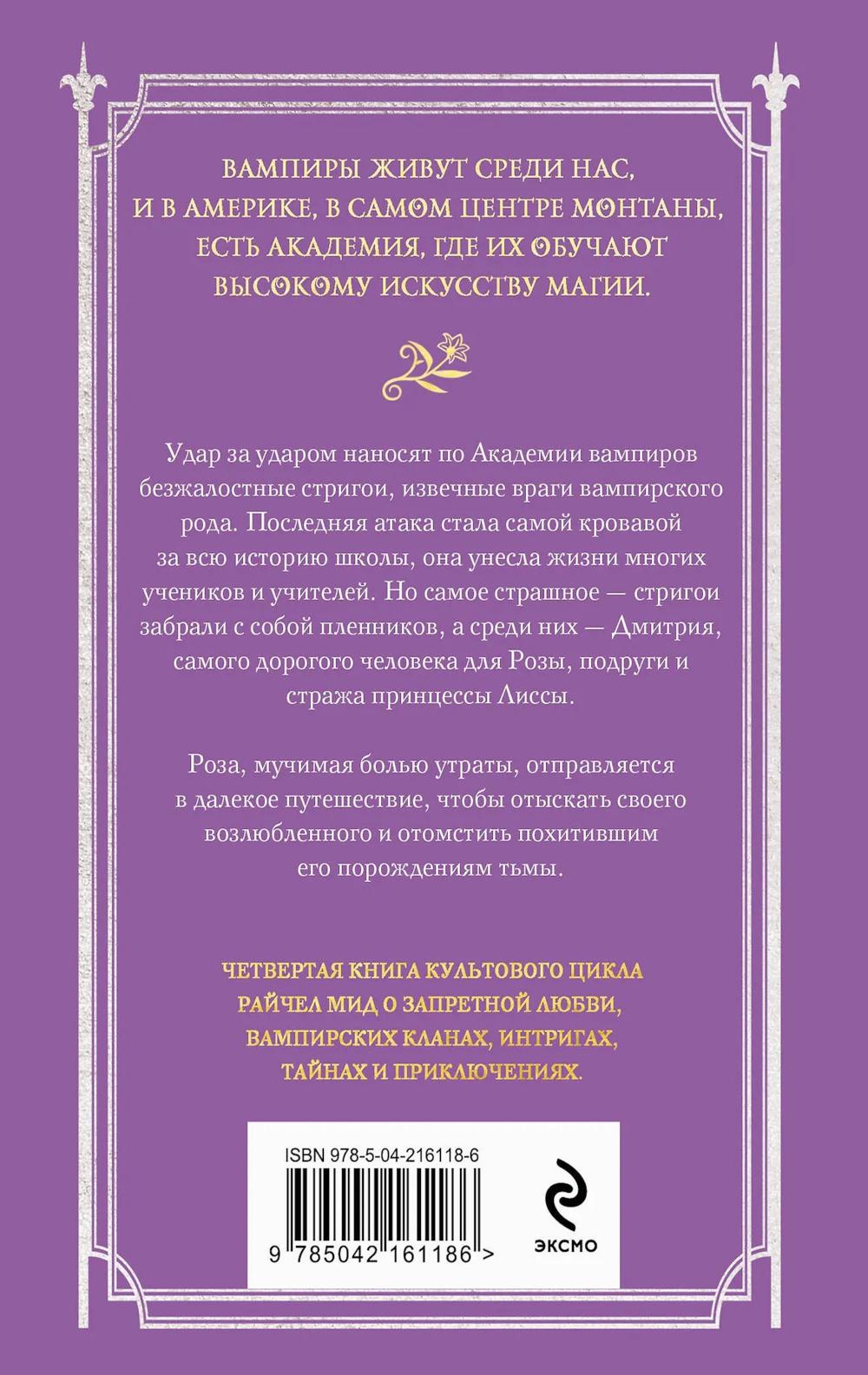 Удар за ударом наносят по Академии безжалостные стригои. Последняя атака стала самой кровавой за всю историю школы, она унесла жизни многих учеников и учителей. Но самое страшное - стригои забрали с собой пленников. И среди них - Дмитрий, самый дорогой для Розы человек. Мучимая болью утраты, Роза отправляется в далёкое путешествие, чтобы отыскать возлюбленного и отомстить похитившим его порождениям тьмы...| Издательство | Эксмо |