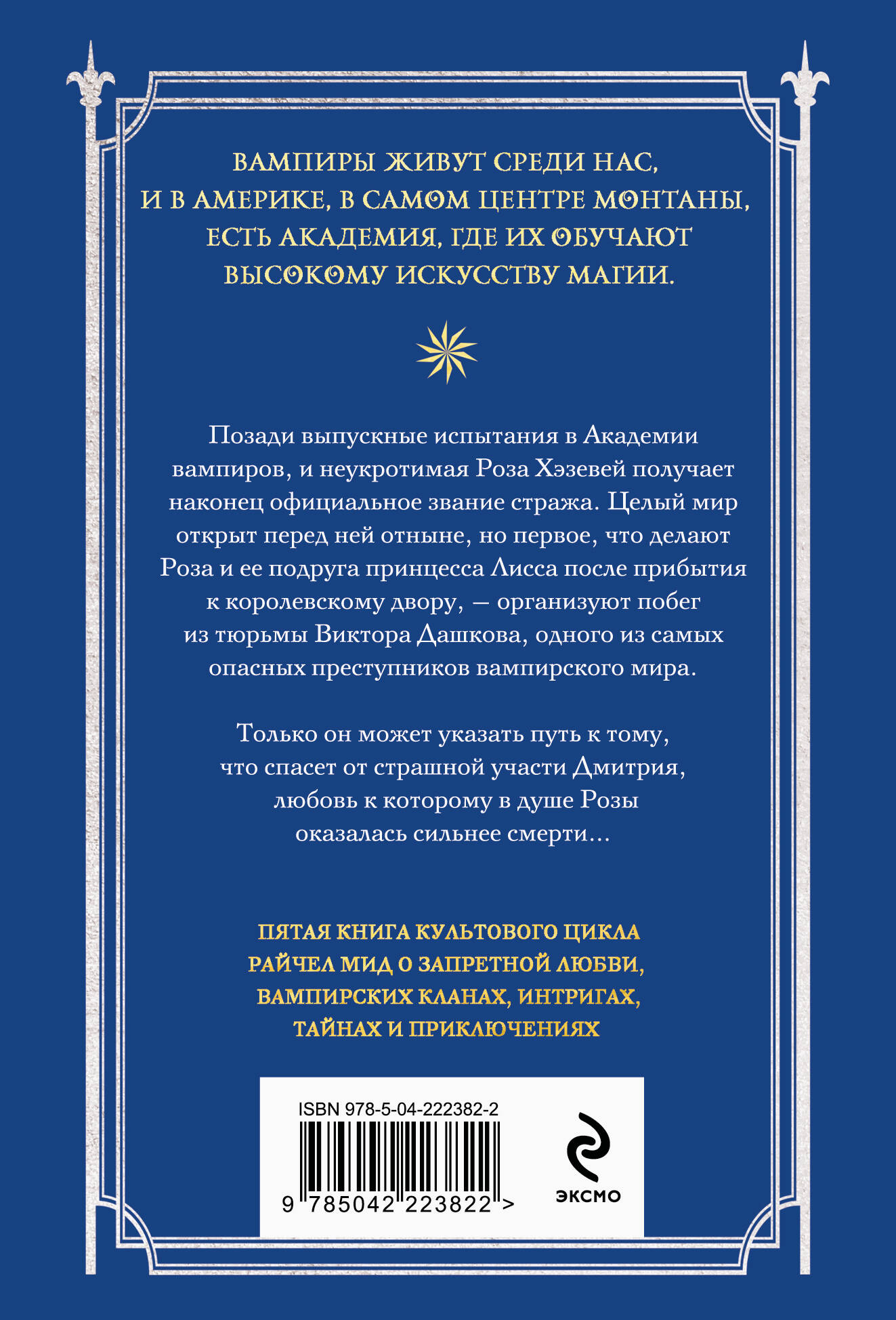 Позади выпускные испытания в Академии вампиров, и неукротимая Роза Хэзевей получает наконец официальное звание стража. Целый мир открыт перед ней отныне, но первое, что делают Роза и ее подруга принцесса Лисса после прибытия к королевскому двору - организуют побег из тюрьмы Виктора Дашкова, одного из самых опасных преступников вампирского мира. Только он может указать путь к тому, чтобы спасти от страшной участи Дмитрия, любовь к которому в душе Розы оказалась сильнее смерти… Пятая книга культового цикла Райчел Мид в удобном формате классического покета.| Издательство | ООО "Издательство "Эксмо" |