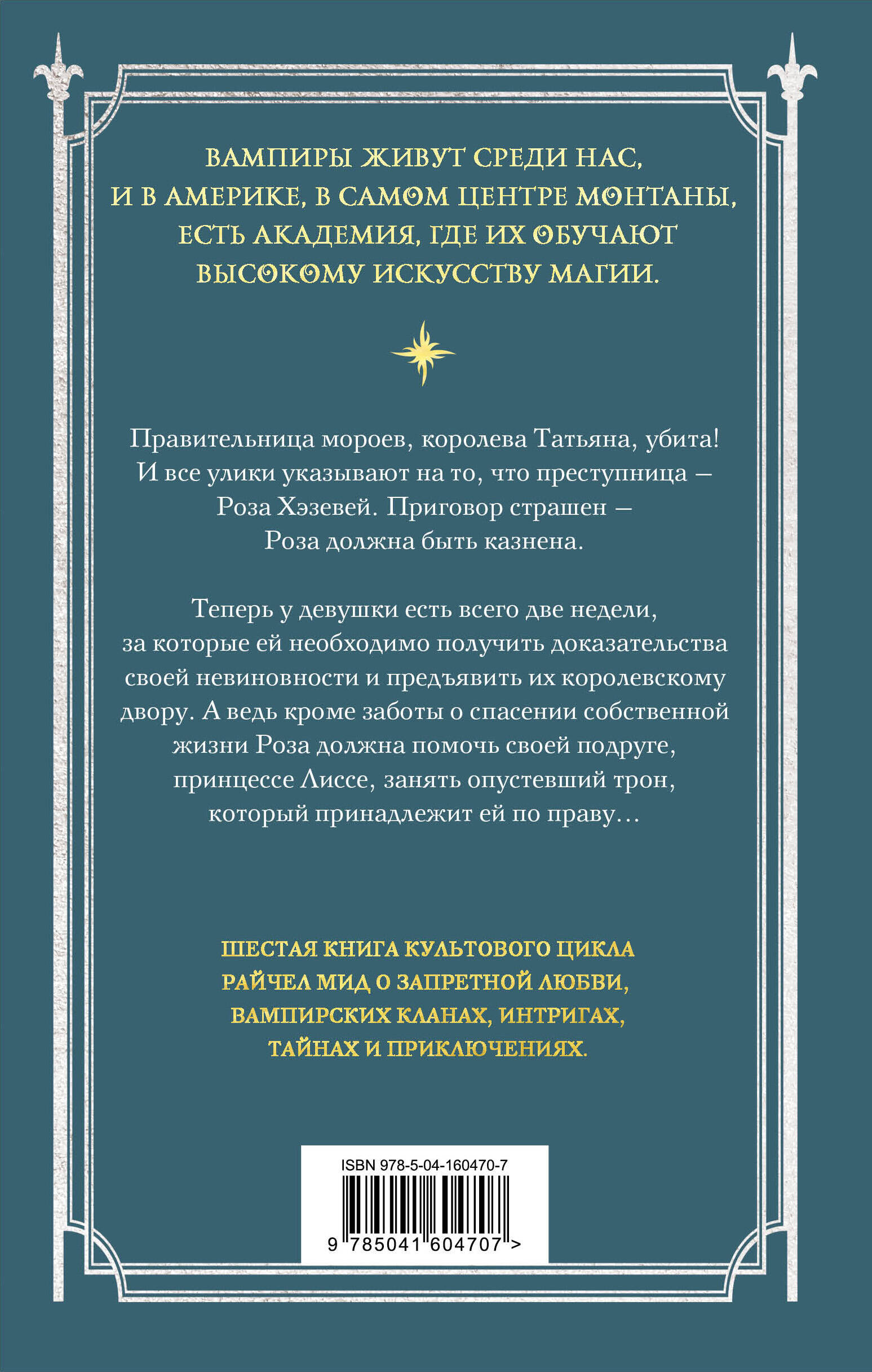 Правительница мороев, королева Татьяна, убита! И все улики указывают на то, что преступница - Роза Хэзевей. Приговор страшен - Роза должна быть казнена. Теперь у девушки есть всего две недели, за которые ей необходимо получить доказательства своей невиновности и предъявить их королевскому двору. А ведь кроме заботы о спасении собственной жизни Роза должна помочь своей подруге, принцессе Лиссе, занять опустевший трон, который принадлежит ей по праву... Шестая и заключительная книга культового цикла Райчел Мид.| Издательство | Эксмо |