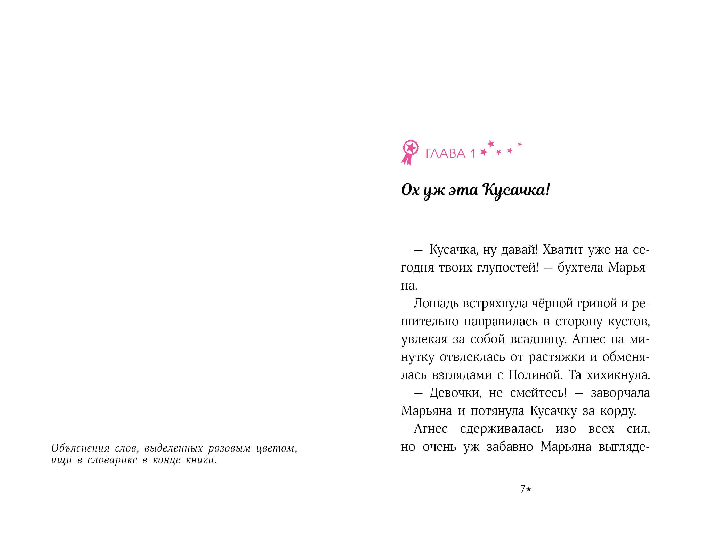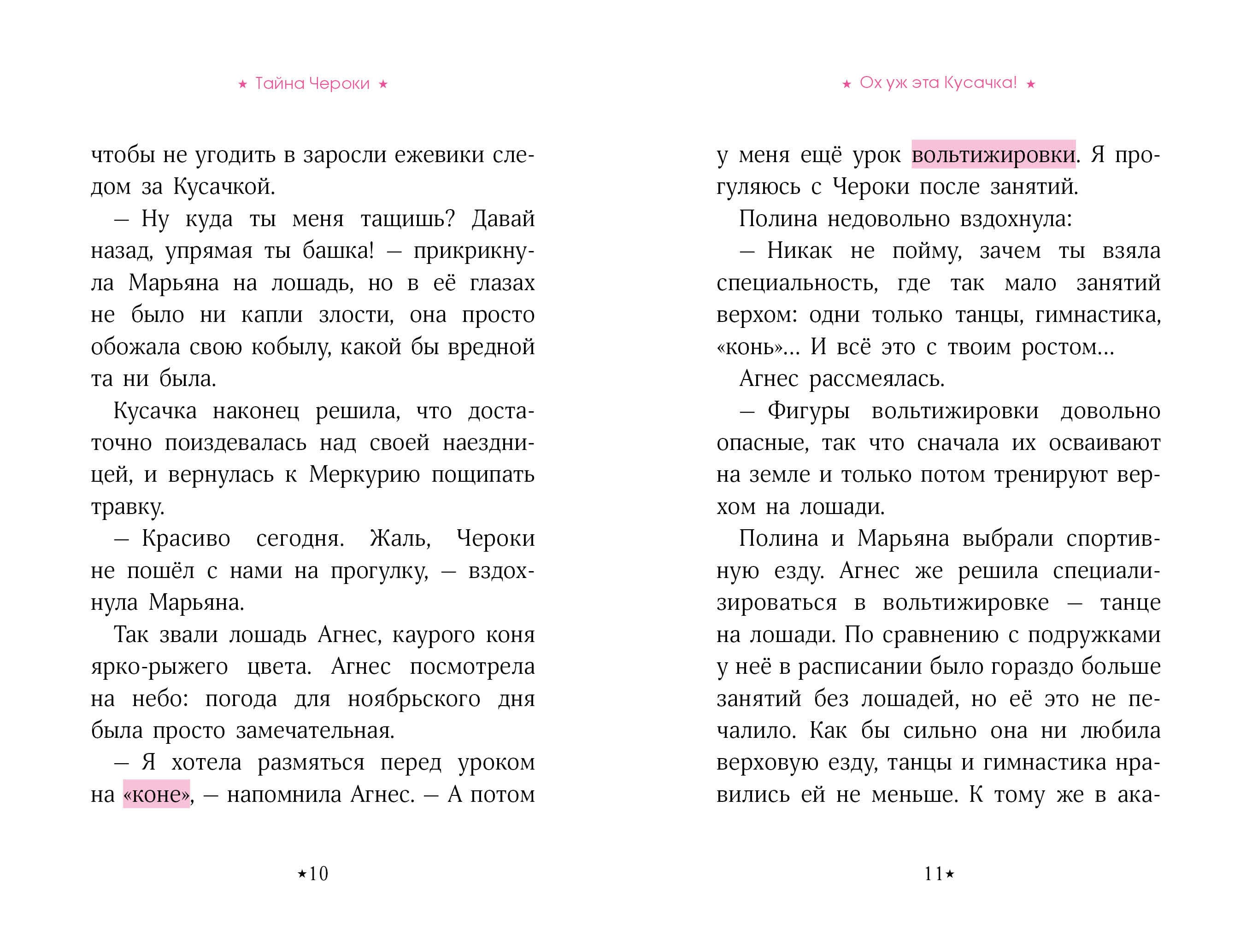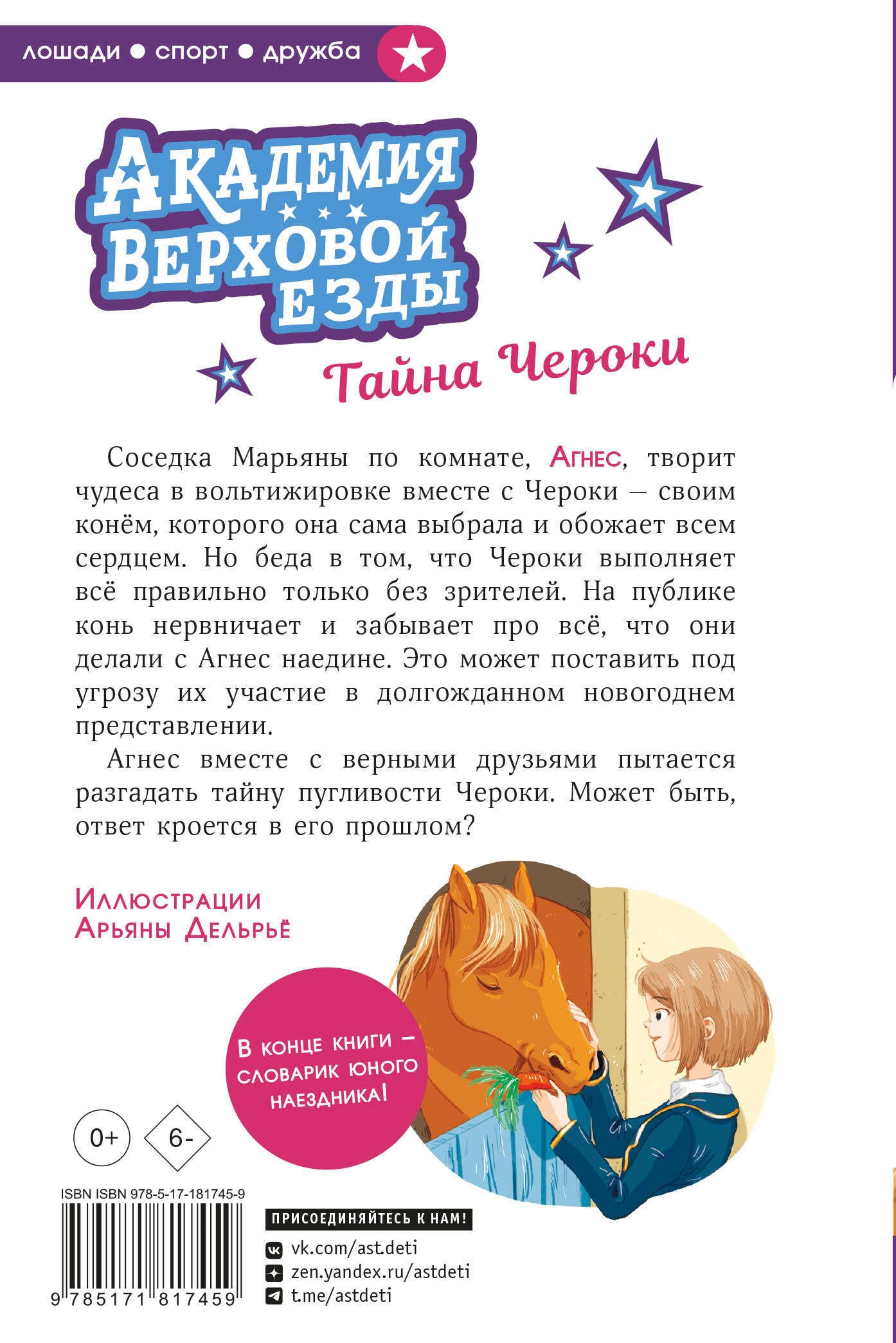 Соседка Марьяны по комнате, Агнес, творит чудеса в вольтижировке вместе с Чероки - своей лошадью, которую она сама выбрала и обожает всем сердцем. Но беда в том, что Чероки выполняет всё правильно только без зрителей. На публике конь нервничает и забывает про всё, что они делали с Агнес наедине. Это может поставить под угрозу их участие в долгожданном новогоднем представлении. Агнес вместе с верными друзьями пытается разгадать тайну пугливости Чероки. Может быть, ответ кроется в его прошлом?| Издательство | Издательство "АСТ" |