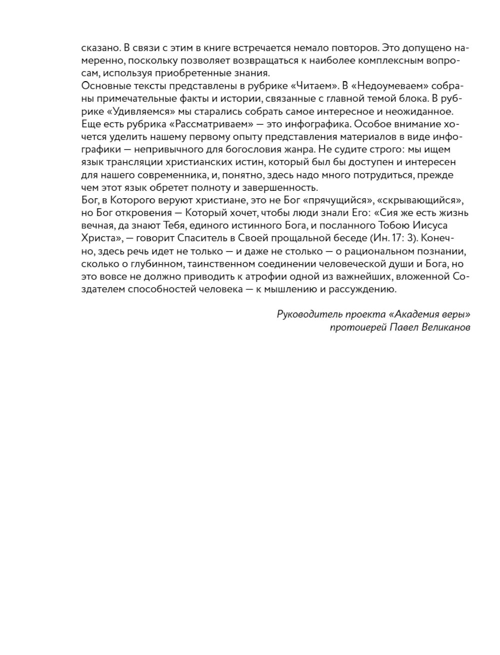 «Академия веры. 40 мини-курсов о православном христианстве для тех, кто хочет верить осознанно» - просветительский проект от команды портала «Богослов. Ru», цель которого - рассказать о христианском вероучении просто, доступно и в то же время ёмко и интересно. Авторы - священники и богословы - смело и открыто говорят с читателем на самые разные темы, отвечают на вопросы, касающиеся не только богословия, но также затрагивают исторические, культурологические и даже психологические аспекты православной веры. Этот проект познакомит вас с глубокими смыслами и историей христианства.| Издательство | Изд. НИКЕЯ |