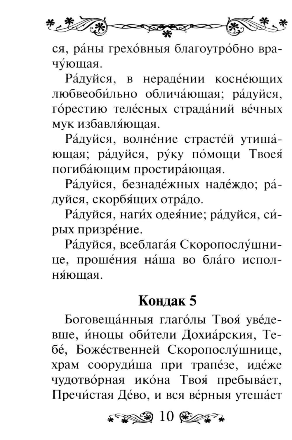 Данное издание содержит акафист Пресвятой Богородице в честь иконы Ее «Скоропослушница». Перед иконой Пресвятой Богородицы «Скоропослушница» молятся о духовном прозрении, когда человек находится в растерянности и не знает как поступить, во всех случаях, когда нужна особенно скорая и действенная помощь в Её молитве к Сыну. Также Богородица через свою икону «Скоропослушница» дарует помощь в излечении от различных заболеваний, даже онкологических. Перед Ее святым образом возносят молитву за детей и о помощи в родах - о рождении здорового ребенка.| Издательство | Духовное преображение |