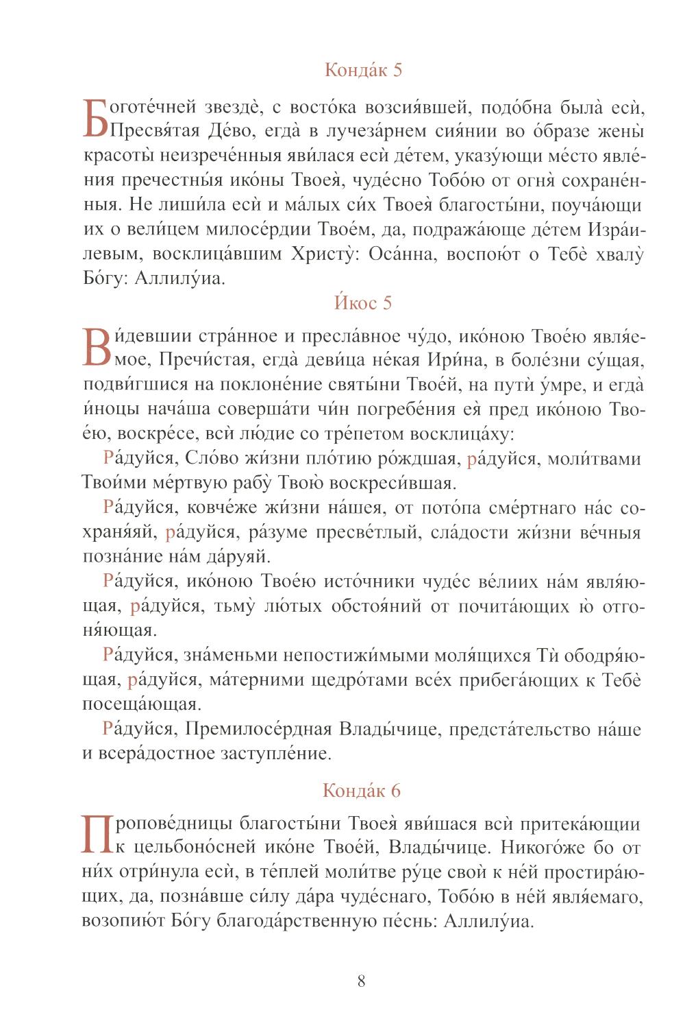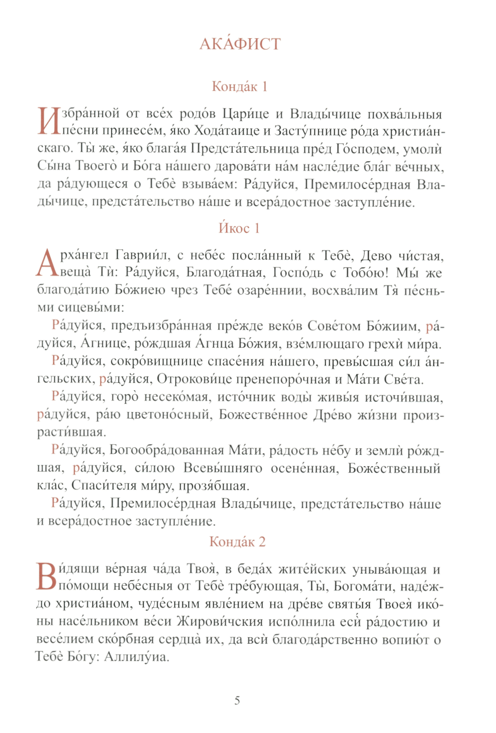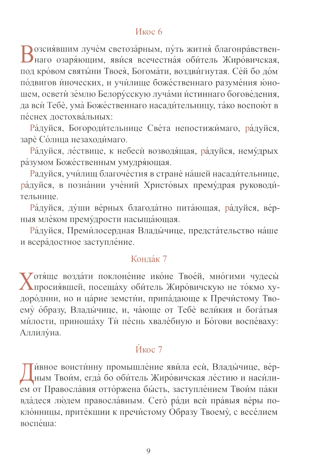 Акафист пред Жировичской иконой Божией Матери составлен со вниманием и тщательностью. Он имеет свою продуманную структуру и богатство содержания. Через весь текст «красной нитью» проходит несколько главных мыслей - глубоких богословских истин и нравственных назиданий, необходимых нам для спасения. Приветствия являют немало примеров высокой поэзии, внимательного отношения к слову и мысли. Содержание Акафиста с богословскими, историческими и филологическими пояснениями раскрыто в статье протоиерея Г. Соколова «Пояснения к акафисту в честь Жировичской иконы Пресвятой Богородицы». В предисловии также приводится история чудотворной иконы Божией Матери, именуемой «Жировичская».| Издательство | Братство в честь св. Архистратига Михаила |
