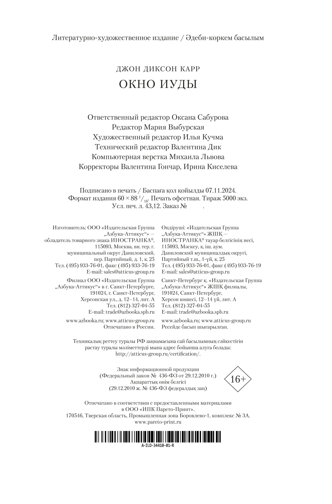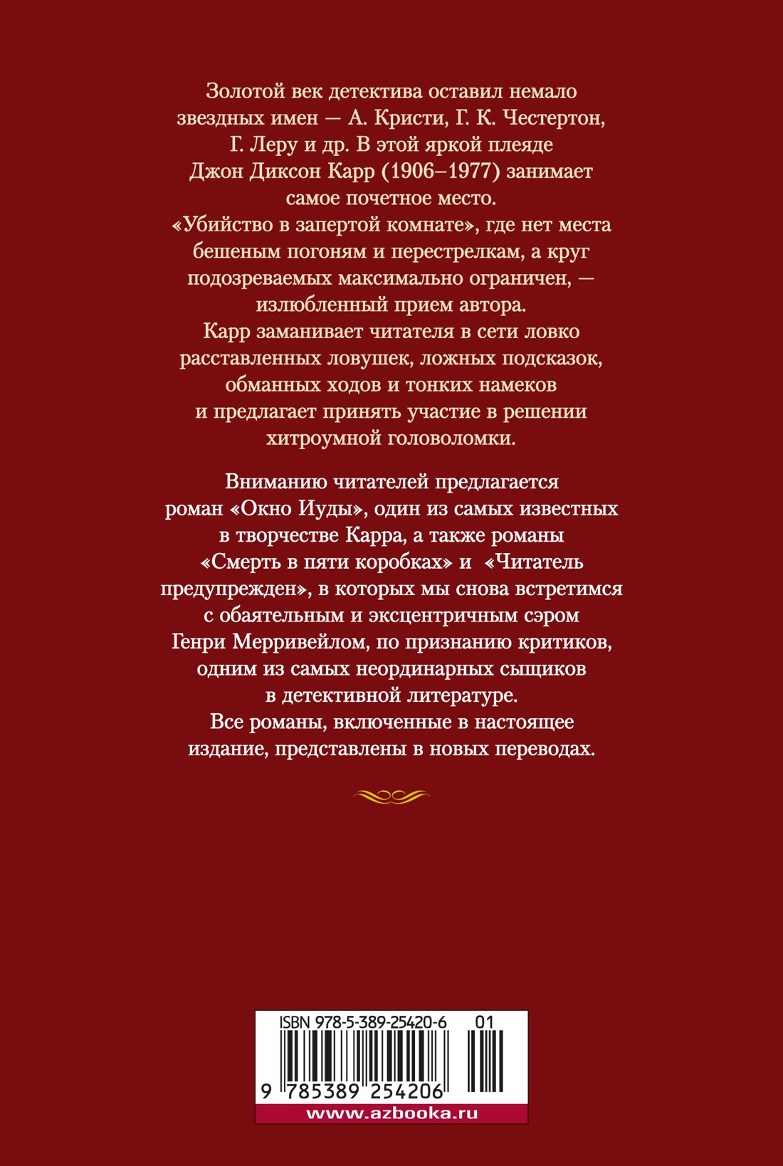 Золотой век детектива оставил немало звездных имен - А. Кристи, Г. К. Честертон, Г. Леру и др. В этой яркой плеяде Джон Диксон Карр (1906-1977) занимает самое почетное место. «Убийство в запертой комнате», где нет места бешеным погоням и перестрелкам, а круг подозреваемых максимально ограничен, - излюбленный прием автора. Карр заманивает читателя в сети ловко расставленных ловушек, ложных подсказок, обманных ходов и тонких намеков и предлагает принять участие в решении хитроумной головоломки. Вниманию читателей предлагается роман «Окно Иуды», один из самых известных в творчестве Карра, а также романы «Смерть в пяти коробках» и «Читатель предупрежден», в которых мы снова встретимся с обаятельным и эксцентричным сэром Генри Мерривейлом, по признанию критиков одним из самых неординарных сыщиков в детективной литературе. Все романы, включенные в настоящее издание, представлены в новых переводах.