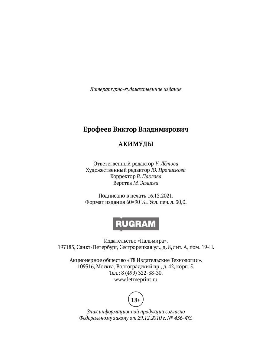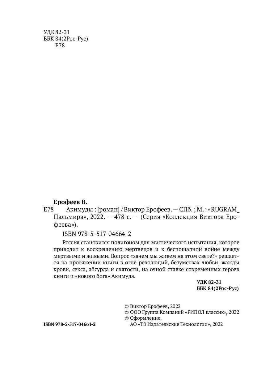 Виктор Ерофеев (р. 1947) - прозаик, пионер русского постмодернизма, снискавший скандальную репутацию ниспровергателя ценностей. Литературовед, видный деятель андеграунда, член Русского ПЕН-центра, лауреат премии имени В. В. Набокова. Его книги переведены на десятки языков и известны во всем мире. Россия становится полигоном для мистического испытания, которое приводит к воскрешению мертвецов и к беспощадной войне между мертвыми и живыми. Вопрос «зачем мы живем на этом свете?» решается на протяжении книги в огне революций, безумствах любви, кровожадности, секса, абсурда и святости, на очной ставке современных героев книги и «нового бога» Акимуда.| Издательство | Т8 RUGRAM |