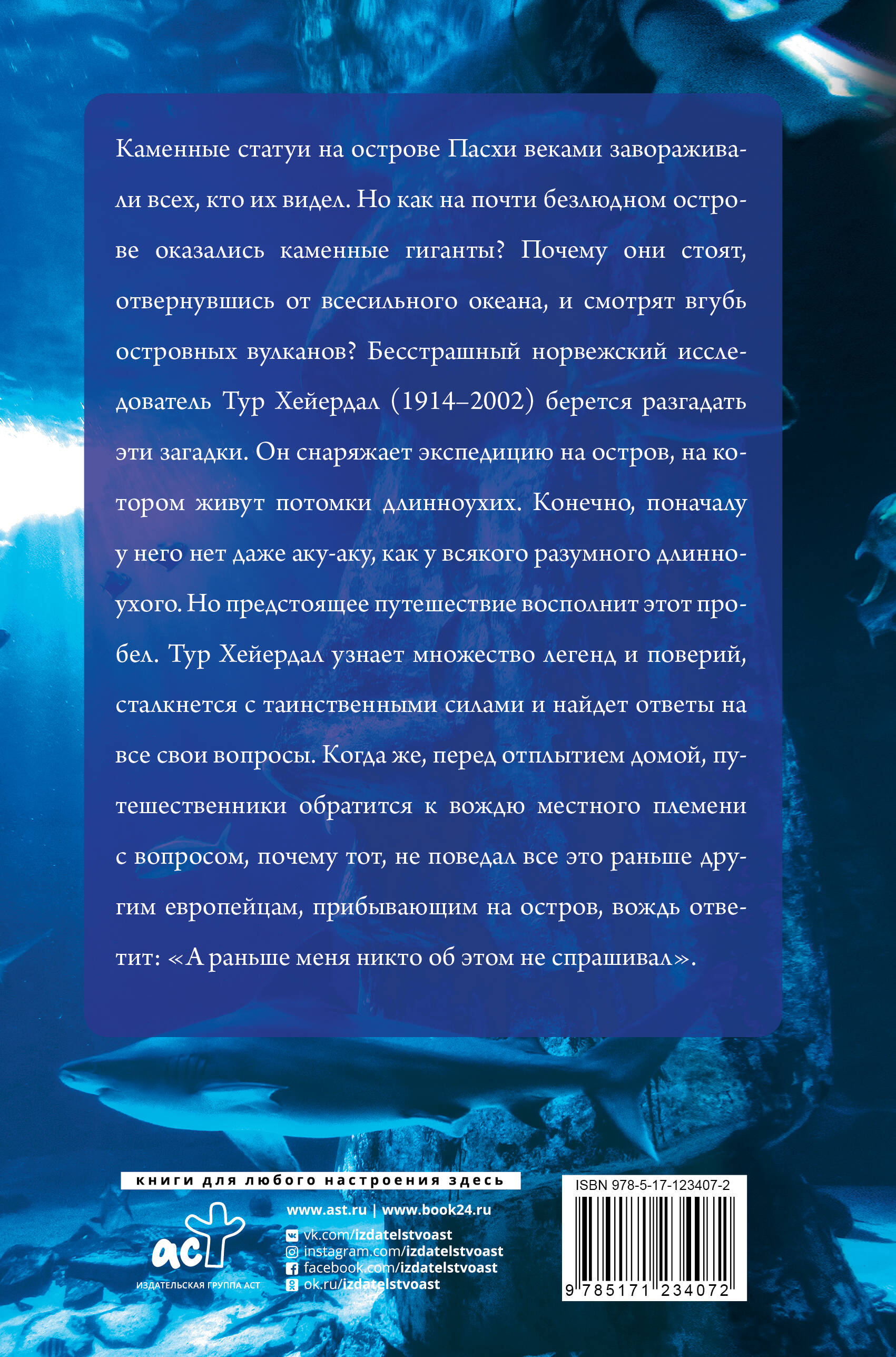 Каменные статуи на острове Пасхи веками завораживали всех, кто их видел. Но как на почти безлюдном острове оказались каменные гиганты? Почему они стоят, отвернувшись от всесильного океана, и смотрят вгубь островных вулканов? Бесстрашный норвежский исследователь Тур Хейердал (1914-2002) берется разгадать эти загадки. Он снаряжает экспедицию на остров, на котором живут потомки длинноухих. Конечно, поначалу у него нет даже аку-аку, как у всякого разумного длинноухого. Но предстоящее путешествие восполнит этот пробел. Тур Хейердал узнает множество легенд и поверий, сталкнется с таинственными силами и найдет ответы на все свои вопросы. Когда же перед отплытием домой путешественники обратятся к вождю местного племени с вопросом, почему тот не поведал все это раньше другим европейцам, прибывавшим на остров, вождь ответит: "А раньше меня никто об этом не спрашивал".| Издательство | Издательство "АСТ" |
