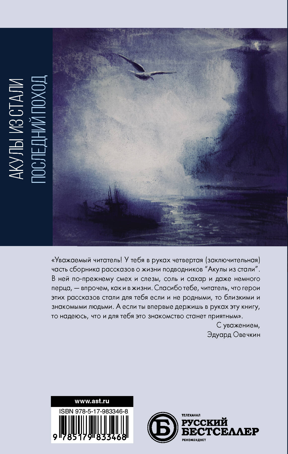 "Акулы из стали. Последний поход" Эдуарда Овечкина - новый сборник веселых и ярких морских рассказав о российских подводниках Северного флота. Книга эта, по сути - гимн профессионализму, целеустремленности, товариществу и мужеству, а главное, находчивости и жизнелюбию элиты российского флота. Если подводный атомоход (АПЛ) - чудо техники, способное бесшумно подплывать вплотную к натовским военным базам в Мексиканском заливе и фотографировать в шезлонгах их высший командный состав, то и моряки-подводники не могут быть людьми заурядными. Особый, то есть творческий и в то же время строго научный подход, отличает их во всем, начиная с использования просроченной сгущенки и заканчивая оформлением пасхальных яиц в суровых условиях дальнего морского похода. Из этой книги вы узнаете, можно ли при помощи радара отличить подводный атомоход от косяка трески, в каких взаимоотношениях с подводными млекопитающими находится личный состав АПЛ и, наконец, как действовать, если вы однажды увидите в приморском городке военных моряков, бегущих по улице в водолазных костюмах, и моряки эти совершенно трезвые.| Издательство | ИЗДАТЕЛЬСТВО "АСТ" |