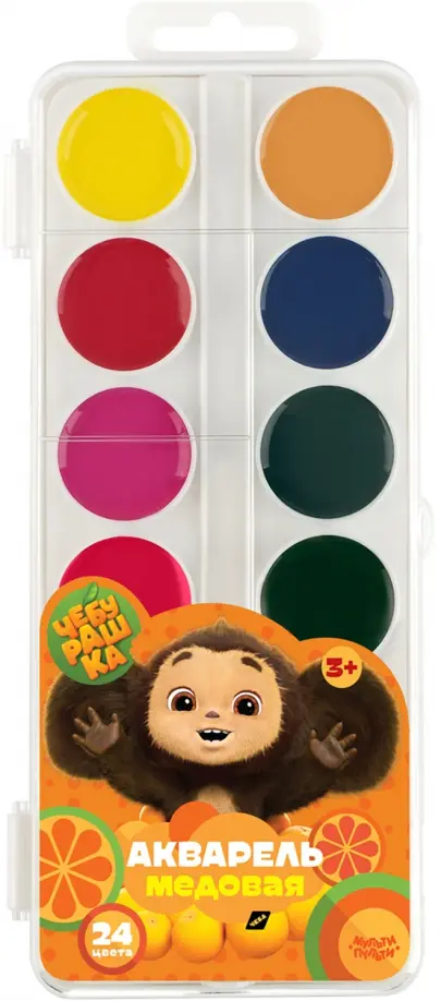 Краски "Мульти-Пульти" серии "Чебурашка" обладают хорошей укрывистостью и остаются яркими при высыхании. Акварель предназначена для детей старше 3-х лет и годится для работы в школе или в детском саду. Смешивание акварели "Мульти-Пульти" дает чистые оттенки. Натуральные компоненты делают ее безопасной для здоровья детей. Пластиковая упаковка акварели удобна в использовании, а наклейка на упаковке с любимым героем - Чебурашкой делает набор красок более интересным и запоминающимся. Яркие краски 24 цветов разделены надёжными кюветами, благодаря которым цвета не смешаются при работе.