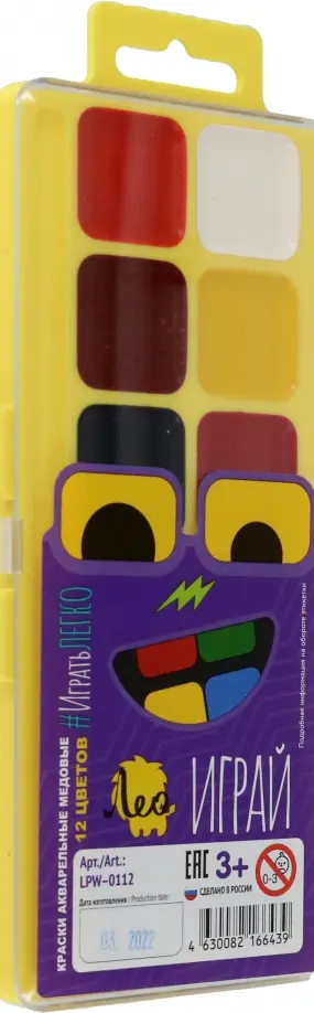 Медовая акварель ТМ Лео серии "Играй" сделает знакомство ребенка с этой непростой техникой приятным, увлекательным и веселым. Прекрасно подходит для занятий рисованием в детском саду, кружках, дома, школе. Акварель разработана с учетом рекомендаций педагогов, безопасна для детей, не токсична. Изготавливается на основе только натуральных компонентов.