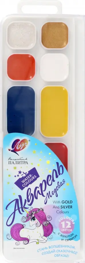 Высококачественная краска для детского творчества, изготовленная по классической рецептуре с использованием мёда. Яркие, чистые цвета. В наборе две кюветы с акварелью цвета «золото» и «серебро». Акварель прекрасно размывается и разносится по поверхности бумаги. Легко наполняется на кисть. Часто используемые цвета в увеличенных кюветах Краска легко смывается с рук и одежды. Безопасна для детей.