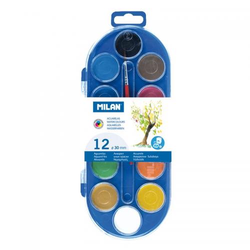 Akvareļa krāsas krāsu diametrs Ø 30 mm. Komplekta ietilpst akvareļa ota otu, kas ir īpaši izstrādāta akvareļu lietošanai. Krāsas var sajaukt mazajās maisīšanas iedobēs korpusa vākā. MILAN akvareļu krāsas tiek pasniegtas kompaktos, apaļos diskos. Krāsas iegūtas no nekaitīgiem, gaismas izturīgiem pigmentiem. Krāsas var viegli izmazgāt no vairuma audumu