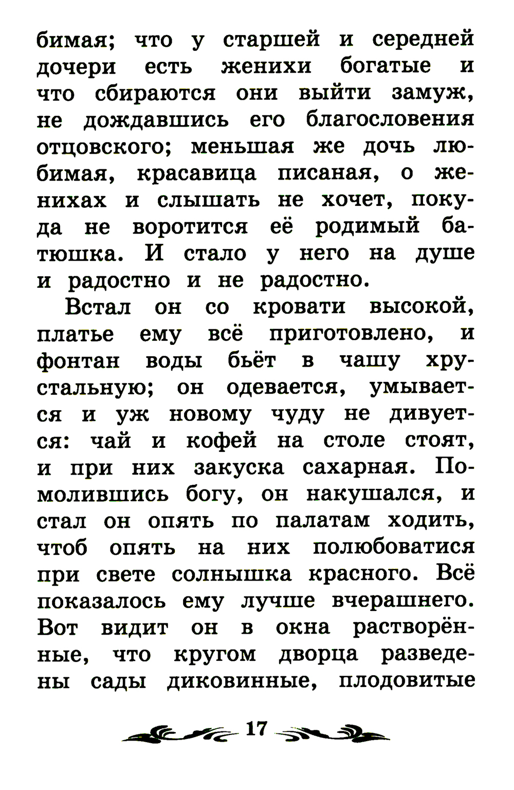 Сергей Тимофеевич Аксаков (1791-1859) - русский писатель, литературный и театральный критик. Родился в Уфе в дворянской семье, принадлежащей к старинному роду, окончил Казанскую гимназию и поступил в Казанский университет. В гимназии С.Т. Аксаков начал писать стихи, в университетские годы участвовал в работе студенческого театра. Не окончив университет, он перебрался в Петербург, где поступил на службу в Комиссию по составлению законов в качестве переводчика. Однако эта работа была не очень интересна будущему писателю, его всё больше увлекала литературная деятельность. В 1847 году С.Т. Аксаков опубликовал «Записки об уженье рыбы», в 1849 - «Записки ружейного охотника», обе книги имели значительный успех. Но по-настоящему писатель прославился своими автобиографическими книгами - «Семейная хроника» (1856) и «Детские годы Багрова-внука» (1858). Как приложение к «Детским годам Багрова-внука» была напечатана и сказка «Аленький цветочек». По словам самого автора, впервые он услышал сюжет «Аленького цветочка» от ключницы Пелагеи: «Эту сказку, которую слыхал я в продолжение нескольких годов не один десяток раз, потому что она мне очень нравилась, впоследствии выучил я наизусть и сам сказывал её». «Аленький цветочек» - одна из многочисленных вариаций сюжета европейской сказки «Красавица и чудовище». Это произведение учит читателей ценить в человеке не наружную красоту, а духовные качества, богатый внутренний мир. Героиня сказки смогла увидеть, что за ужасающей внешностью зверя скрыто доброе и любящее сердце, смогла полюбить «зверя лесного, чудо морское» и тем самым разрушить колдовские чары. Для младшего школьного возраста. Текст произведения приводится без сокращений.| Издательство | Феникс |