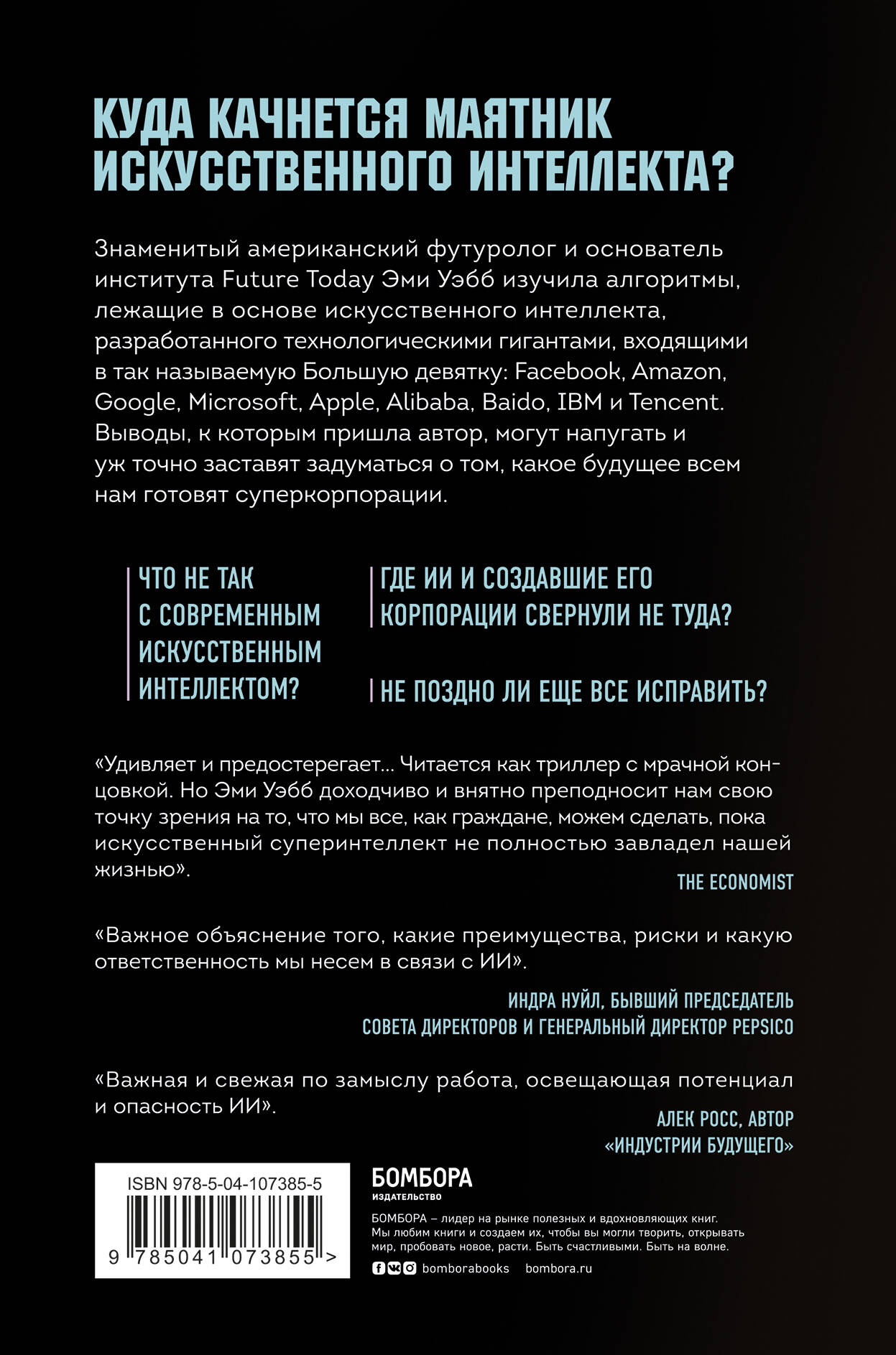 Автор книги Эми Уэбб - генеральный директор и старший аналитик ведущей международной организации по прогнозированию и стратегическому планированию Future Today. Именно здесь крупнейшие мировые корпорации, банки и межправительственные организации получают самые точные прогнозы относительно будущего мировой экономики, социальных структур, технологий. В ходе своей работы Уэбб обнаружила поистине пугающие вещи, относящиеся к деятельности так называемой «Большой девятки» - девяти крупнейших мировых технологических корпораций. Их разработки на основе искусственного интеллекта, возможно, полностью изменят наш мир уже в самом ближайшем будущем. А вот хорошими или плохими будут эти изменения - решать вам.| Издательство | Эксмо |