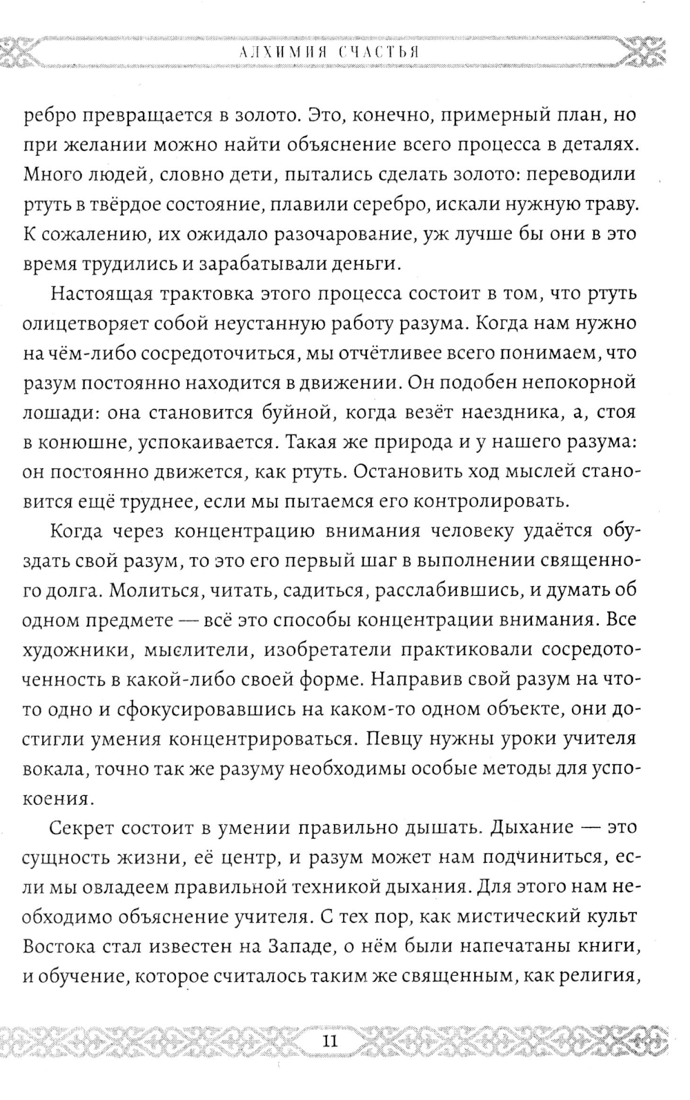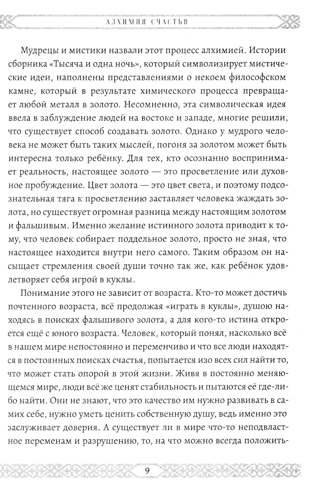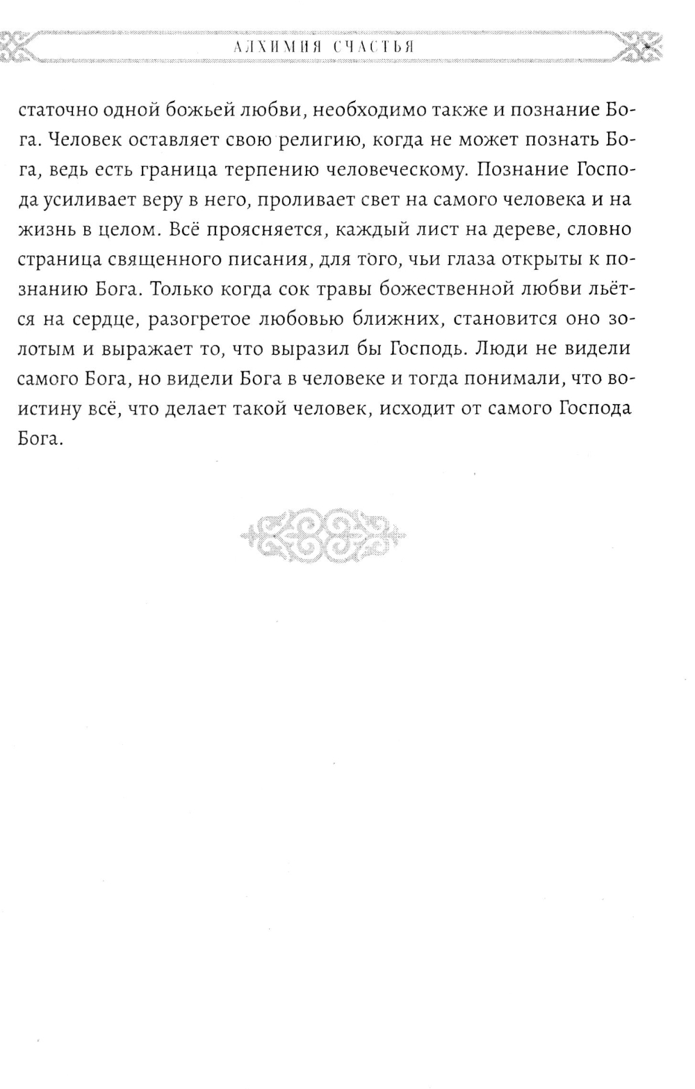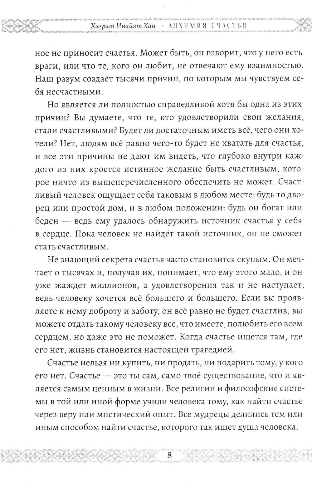 «Алхимия счастья» - это произведение известного индийского музыканта, философа и суфия Хазрата Инайят Хана (1882-1927), посвящённое способам достижения счастья. Автор утверждает, что есть незыблемые духовные принципы, следование которым делает человека счастливым. В книга затронуто довольно большое количество тем. Это цель жизни человека и его предназначение, развитие личности, самопознание, осознанность, ответственное и многие другие. Для широкого круга читателей, идущих путём духовного развития.