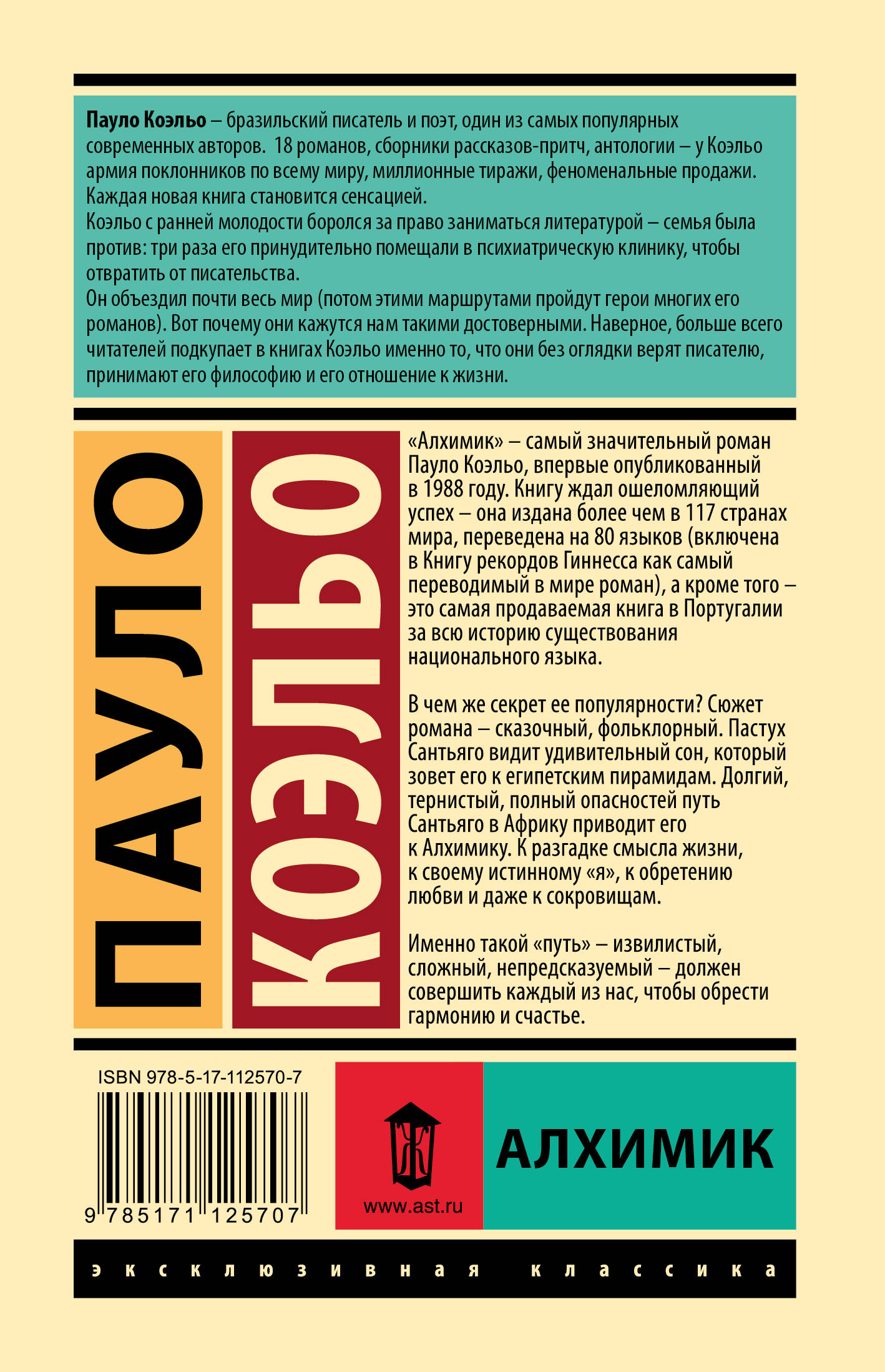 Алхимик" - самый известный роман бразильского писателя Пауло Коэльо, любимая книга миллионов людей во всем мире. В юности люди не боятся мечтать, все кажется им возможным. Но проходит время, и таинственная сила принимается им внушать, что их желания неосуществимы. "Добиться воплощения своей Судьбы - вот единственная подлинная обязанность человека…" - утверждает Пауло Коэльо. Этот ставший культовым роман-притча способен изменить жизнь своих читателей.| Издательство | ИЗДАТЕЛЬСТВО "АСТ" |
