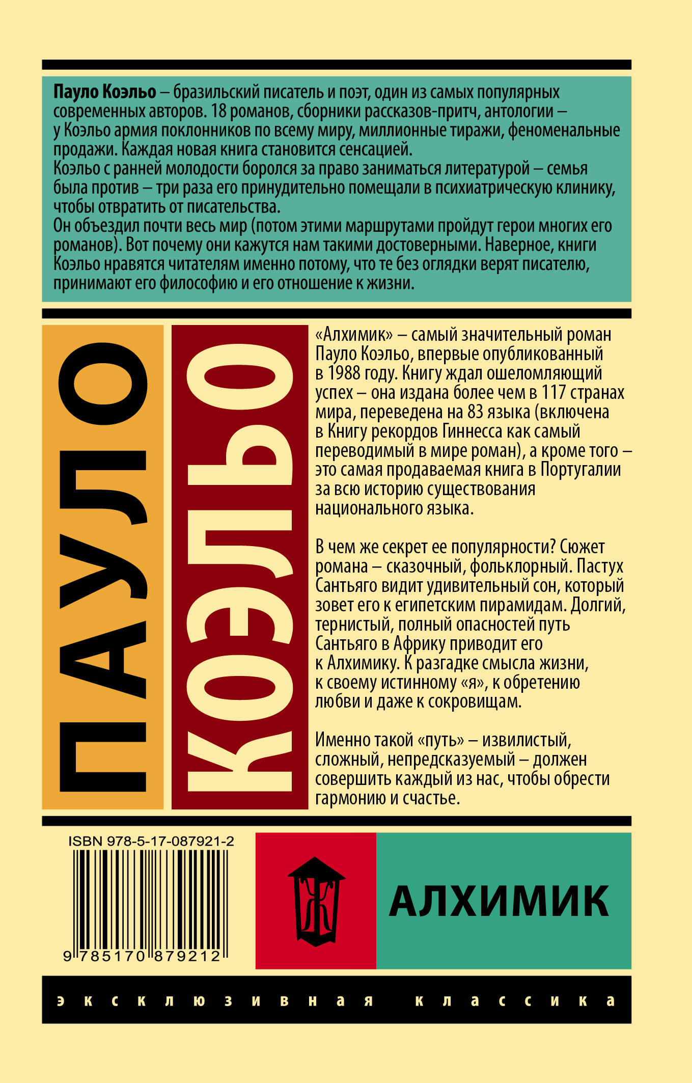 Алхимик" - самый известный роман бразильского писателя Пауло Коэльо, любимая книга миллионов людей во всем мире. В юности люди не боятся мечтать, все кажется им возможным. Но проходит время, и таинственная сила принимается им внушать, что их желания неосуществимы. "Добиться воплощения своей Судьбы - вот единственная подлинная обязанность человека…", - утверждает Пауло Коэльо. Этот, ставший культовым, роман-притча способен изменить жизнь своих читателей.| Издательство | ИЗДАТЕЛЬСТВО "АСТ" |