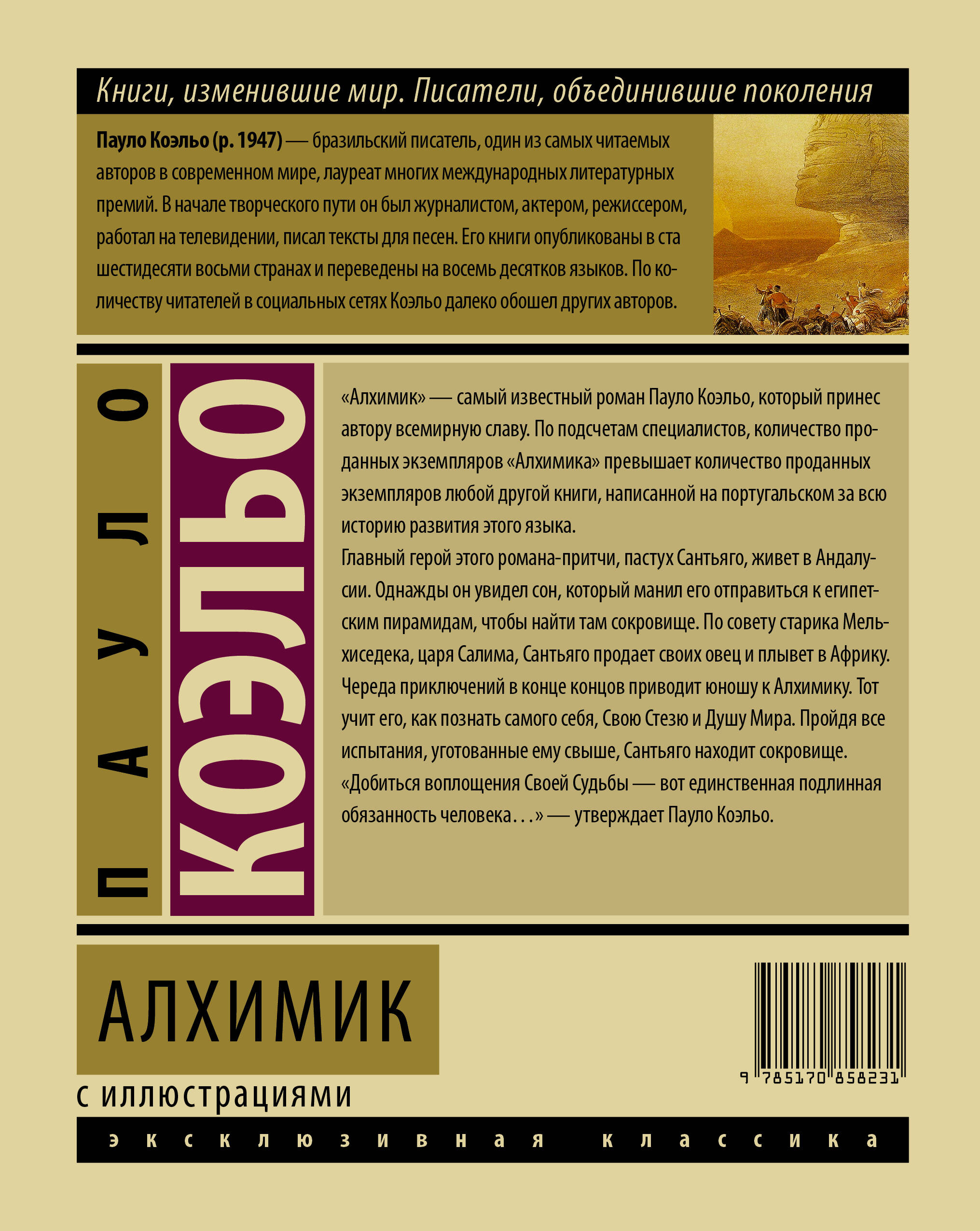 "Алхимик" - самый известный роман Пауло Коэльо, он увидел свет в 1988 году и сразу принес автору всемирную славу. По подсчетам специалистов, количество проданных экземпляров "Алхимика" превышает количество проданных экземпляров любой другой книги, написанной на португальском за всю историю развития этого языка. Главный герой этого романа-притчи, пастух Сантьяго, живет в Андалусии. Однажды он увидел сон, который манил его отправиться к египетским пирамидам, чтобы найти там сокровище. По совету старика Мельхиседека, царя Салима, Сантьяго продает своих овец и плывет в Африку. Череда приключений в конце концов приводит юношу к Алхимику. Тот учит его, как познать самого себя, Свою Стезю и Душу Мира. Пройдя все испытания, уготованные ему свыше, Сантьяго находит сокровище. "Добиться воплощения Своей Судьбы - вот единственная подлинная обязанность человека…" - утверждает Пауло Коэльо.| Издательство | Издательство "АСТ" |