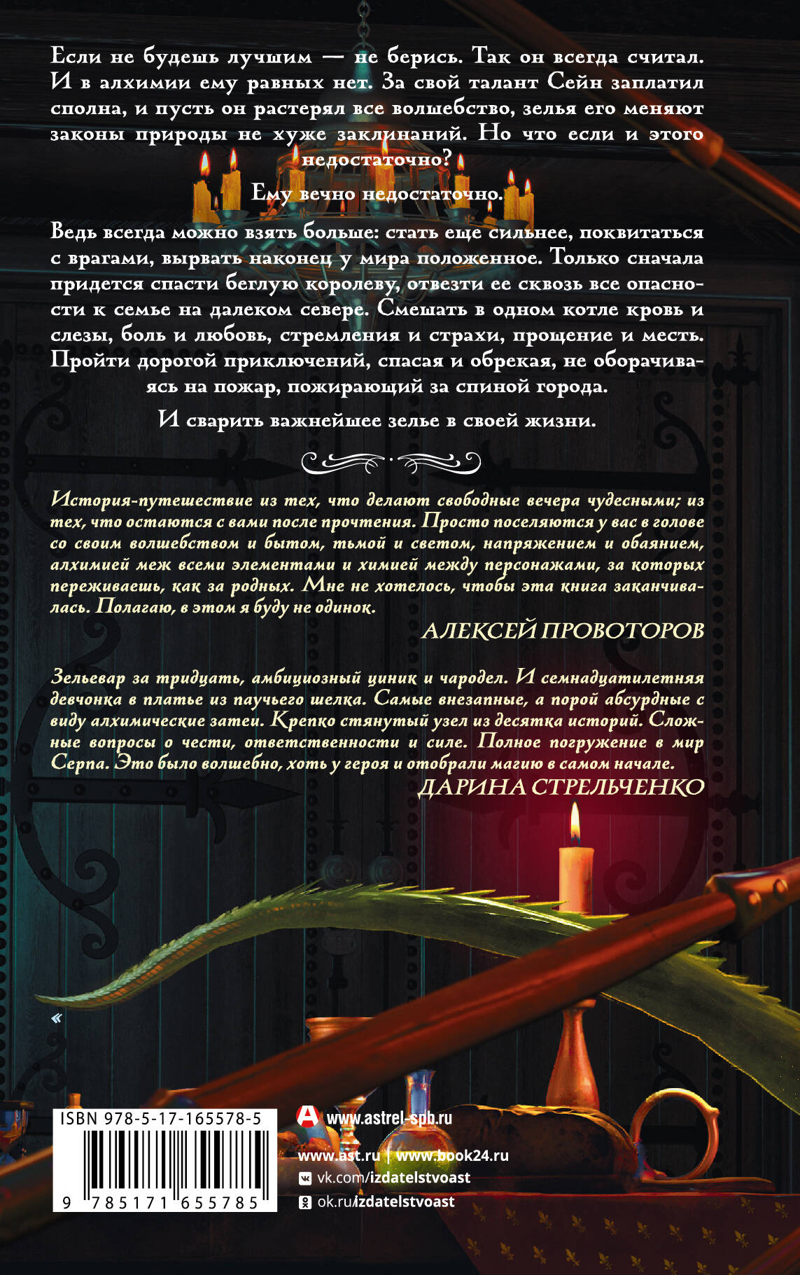 Если не будешь лучшим - не берись. Так он всегда считал. И в алхимии ему равных нет. За свой талант Сейн заплатил сполна, и пусть он растерял все волшебство, зелья его меняют законы природы не хуже заклинаний. Но что если и этого недостаточно? Ему вечно недостаточно. Ведь всегда можно взять больше: стать еще сильнее, поквитаться с врагами, вырвать наконец у мира положенное. Только сначала придется спасти беглую королеву, отвезти ее сквозь все опасности к семье на далеком севере. Смешать в одном котле кровь и слезы, боль и любовь, стремления и страхи, прощение и месть. Пройти дорогой приключений, спасая и обрекая, не оборачиваясь на пожар, пожирающий за спиной города. И сварить важнейшее зелье в своей жизни.| Издательство | Издательство "АСТ" |