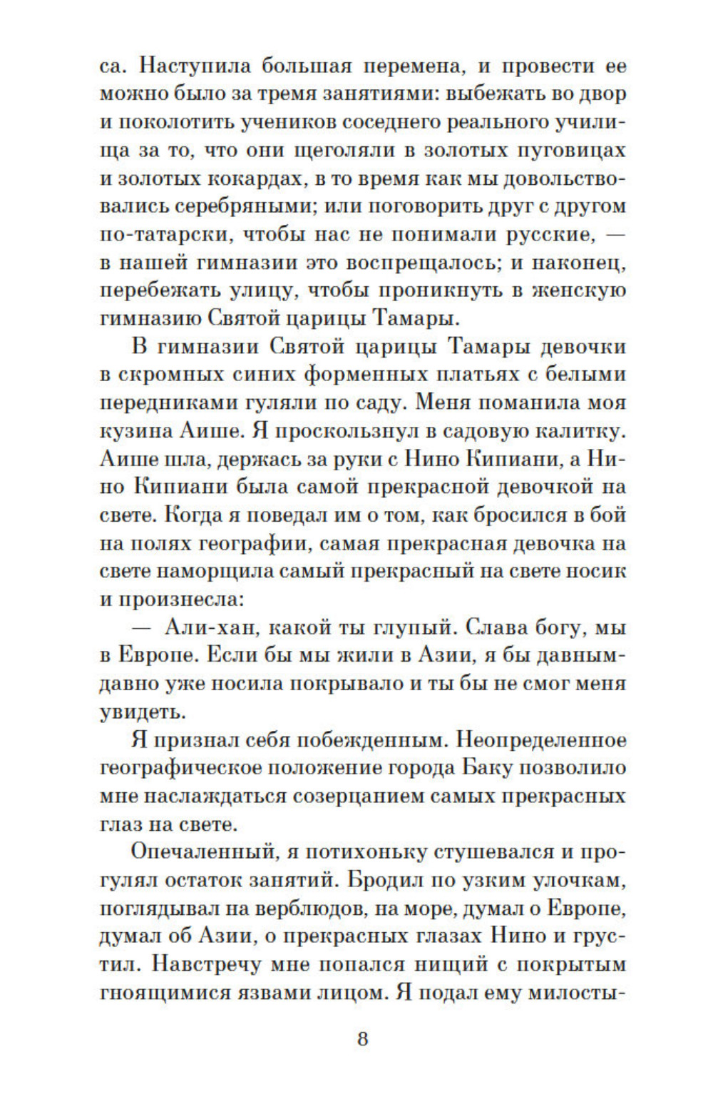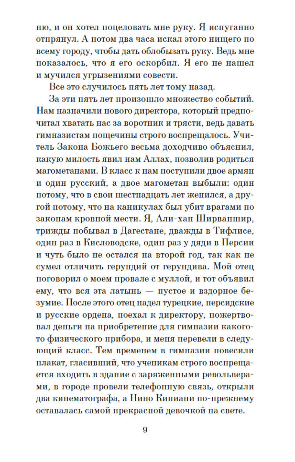 Подлинное имя автора, скрывающегося за псевдонимом Курбан Саид, до сих пор вызывает споры. Его знаменитый роман «Али и Нино» был впервые опубликован в 1937 году в Вене. Долгое время книга считалась утраченной, и только в 70-е годы XX века был обнаружен ее английский перевод. Персонажи книги триумфально вернулись на прилавки книжных магазинов, чтобы стать одной из самых известных влюбленных пар XX века. Сегодня роман переведен на тридцать три языка, по нему ставят пьесы, снимают фильмы, а в Батуми его героям установили памятник. Накануне русской революции 1917 года пылкий мусульманин Али и прекрасная христианка Нино полюбили друг друга. Они почти не надеются связать свои судьбы, ведь подобный союз запрещают религия и обычаи. Благодаря заступничеству друга, убеждающего их близких согласиться на этот брак, их страстная мечта получает шанс осуществиться… Роман публикуется в новом переводе.