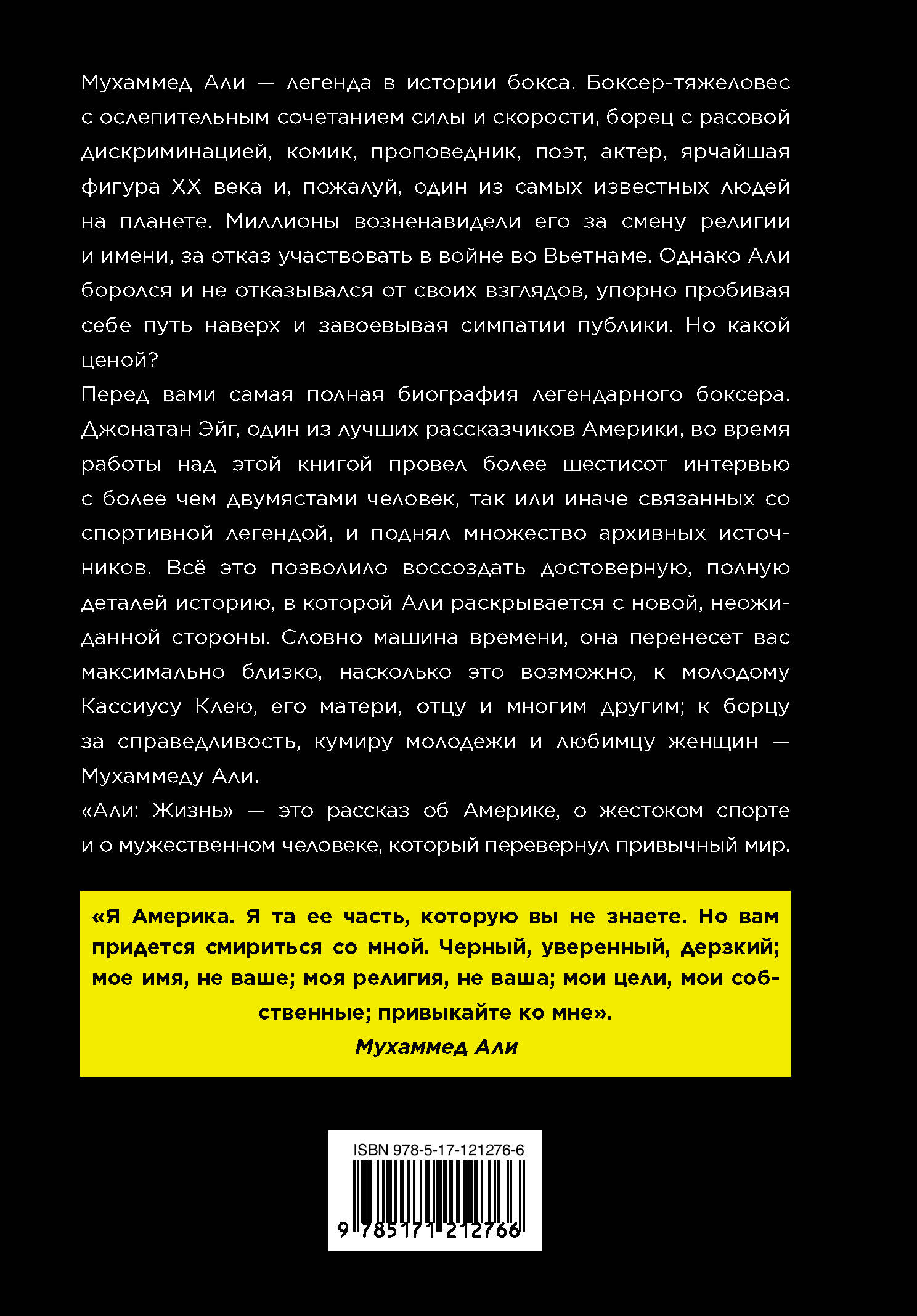 Джонатан Эйг, один из лучших рассказчиков Америки, во время работы над этой книгой провел более шестисот интервью с более чем двумястами человек, так или иначе связанных со спортивной легендой, и поднял множество архивных источников. Всё это позволило воссоздать достоверную, полную деталей историю, в которой Али раскрывается с новой, неожиданной стороны. Словно машина времени она перенесет вас максимально близко, насколько это возможно, к молодому Кассиусу Клею, его матери, отцу и многим другим; к борцу за справедливость, кумиру молодежи и любимцу женщин - Мухаммеду Али.| Издательство | ИЗДАТЕЛЬСТВО "АСТ" |