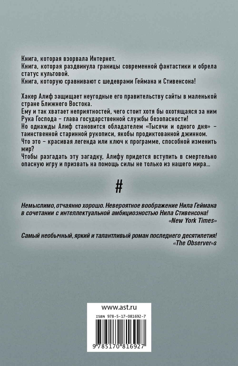 Книга, которая взорвала Интернет. Книга, которая раздвинула границы современной фантастики и обрела статус культовой. Книга, которую сравнивают с шедеврами Геймана и Стивенсона! Хакер Алиф защищает неугодные его правительству сайты в маленькой стране Ближнего Востока. Ему и так хватает неприятностей, чего стоит хотя бы охотящаяся за ним Рука Господа - глава государственной службы безопасности! Но однажды Алиф становится обладателем «Тысячи и одного дня» -таинственной старинной рукописи, якобы продиктованной джинном. Что это - красивая легенда или ключ к программе, способной изменить мир? Чтобы разгадать эту загадку, Алифу придется вступить в смертельно опасную игру и призвать на помощь силы не только из нашего мира… Немыслимо, отчаянно хорошо. Невероятное воображение Нила Геймана в сочетании с интеллектуальной амбициозностью Нила Стивенсона! «New York Times» Самый необычный, яркий и талантливый роман последнего десятилетия! «The Observer».