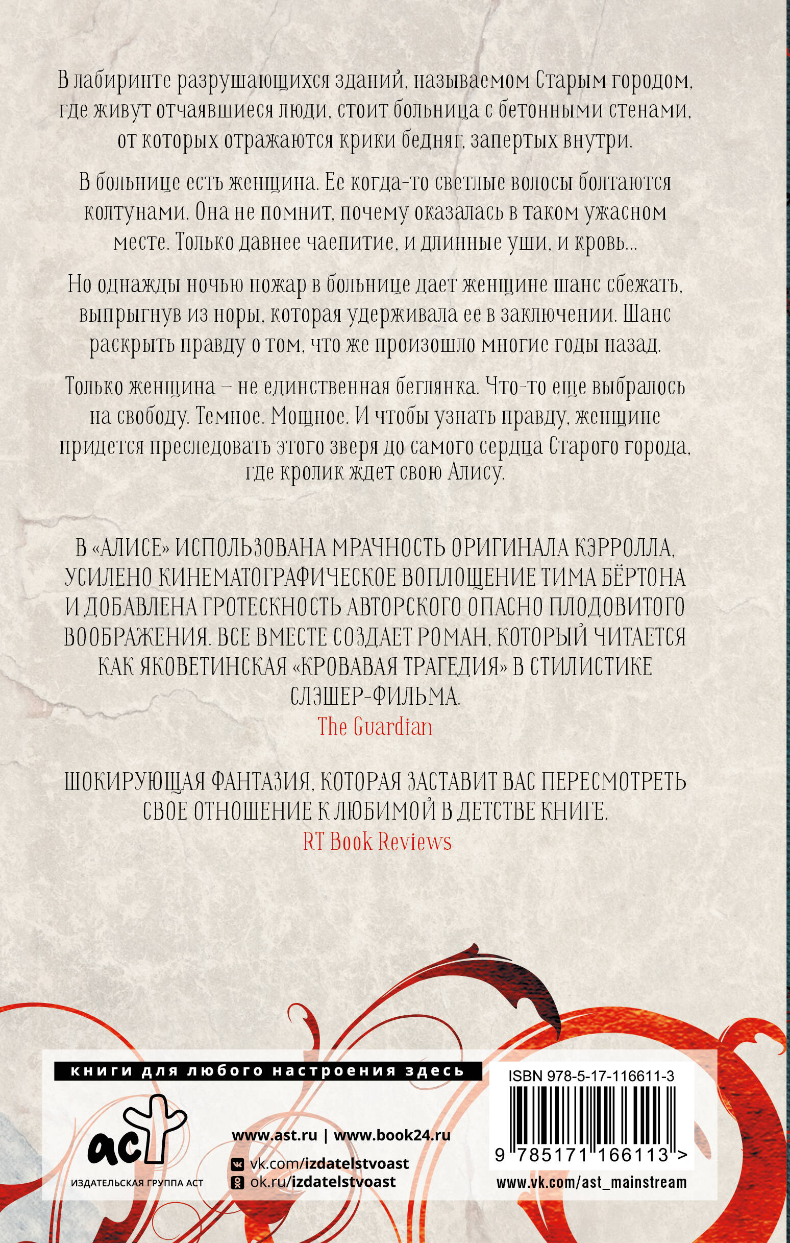 В лабиринте разрушающихся зданий, называемом Старым городом, где живут отчаявшиеся люди, стоит больница с бетонными стенами, от которых отражаются крики бедняг, запертых внутри. В больнице есть женщина. Ее когда-то светлые волосы болтаются колтунами. Она не помнит, почему оказалась в таком ужасном месте. Только давнее чаепитие, и длинные уши, и кровь ... Но однажды ночью пожар в больнице дает женщине шанс сбежать, выпрыгнув из норы, которая удерживала ее в заключении. Шанс раскрыть правду о том, что же произошло многие годы назад. Только женщина - не единственная беглянка. Что-то еще выбралось на свободу. Темное. Мощное. И чтобы узнать правду, женщине придется преследовать этого зверя до самого сердца Старого города, где кролик ждет свою Алису.| Издательство | ИЗДАТЕЛЬСТВО "АСТ" |