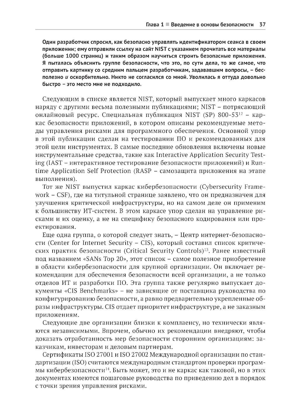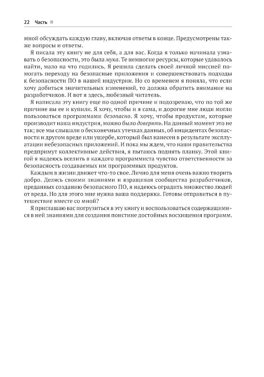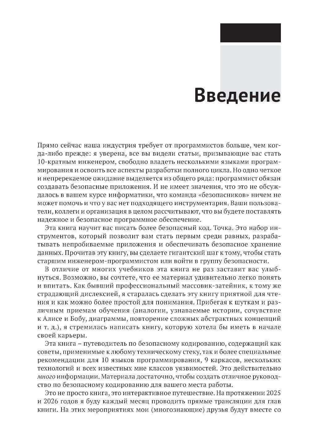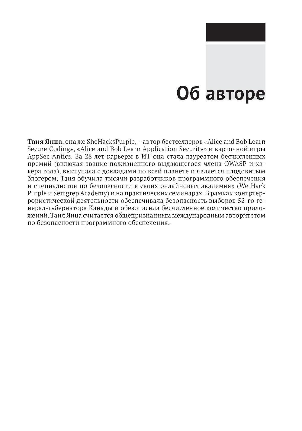 В этой книге, предлагающей принципиально новый подход к безопасной разработке кода, вы найдете полезные аналогии, истории из жизни вымышленных персонажей Алисы и Боба, примеры реальных ситуаций, технические объяснения и диаграммы, благодаря которым запутанные идеи и понятия безопасности приобретают легко усваиваемую форму, позволяющую начать применять их немедленно. Научитесь создавать безопасный код на таких популярных языках, как Python, Java, JavaScript и других. Получите опыт защиты таких каркасов, как Angular, .Net и React. Раскройте секреты борьбы с уязвимостями, основанные на заботе о безопасности своего кода с самого начала! Краткое содержание книги: - безопасное кодирование на Python, Java, Javascript, C/C++, SQL, C#, PHP и других языках; - безопасность в популярных каркасах Angular, Express, React, .Net и Spring; - рекомендации по обеспечению безопасности API, мобильных приложений, веб-сокетов, бессерверных приложений, IоТ-устройств и сетки служб; - основные категории уязвимостей, как они возникают, их риски и способы их избежать; - безопасный жизненный цикл разработки системы; - моделирование угроз, тестирование и анализ кода; - основы создания безопасного кода, применимые к любому языку и каркасу. Издание предназначено для широкой аудитории, включающей разработчиков ПО всех уровней, инженеров по безопасности, архитекторов программ и специалистов в области безопасности приложений. Знакомство с практическими примерами и конкретными приложениями углубит ваше понимание важнейших принципов безопасности и позволит прочно усвоить их.| Издательство | ДМК Пресс |