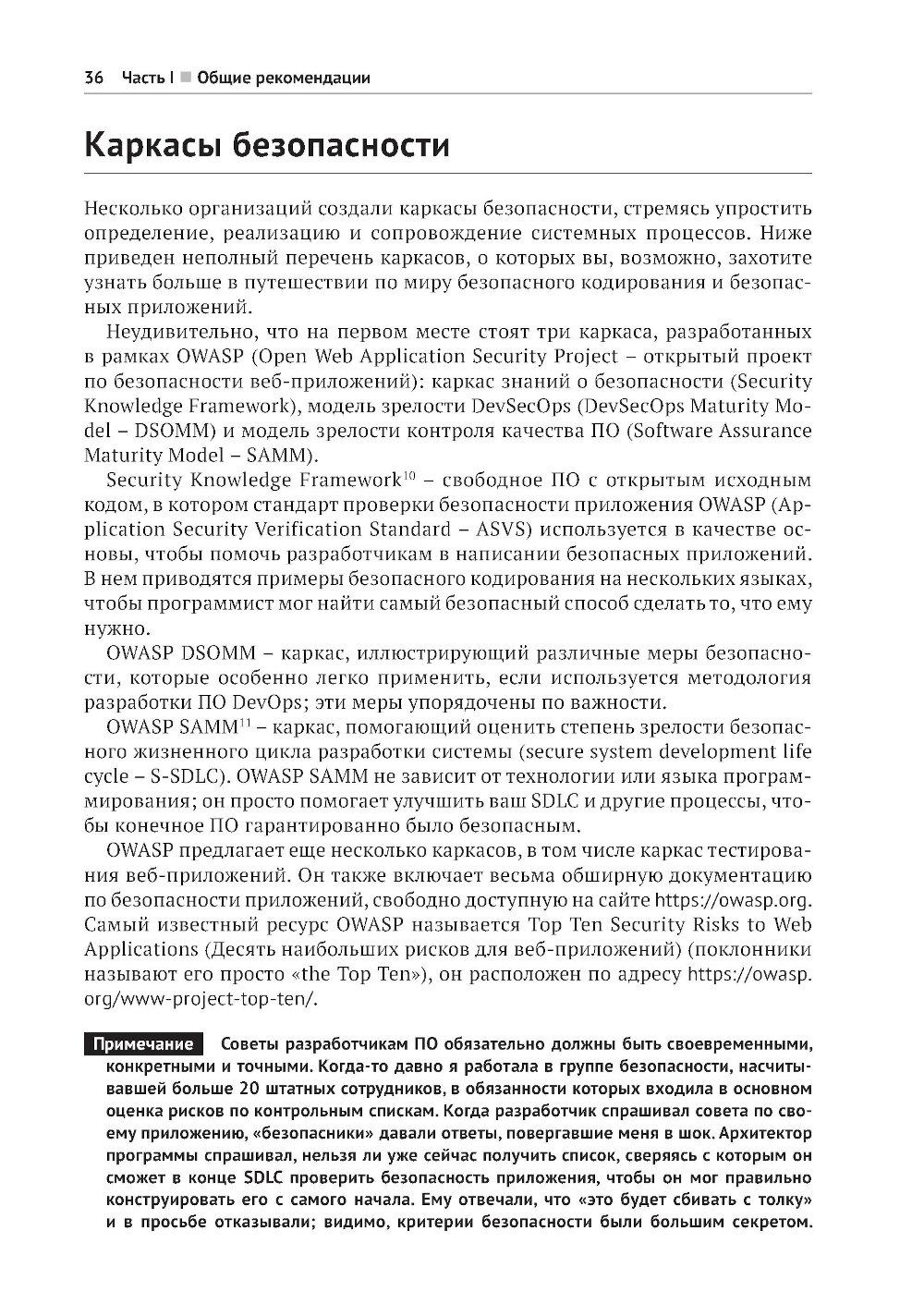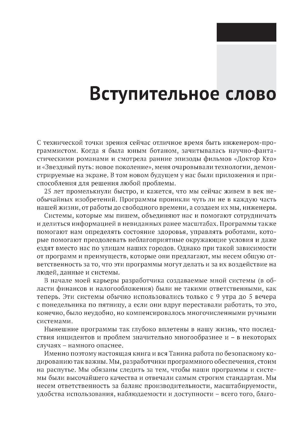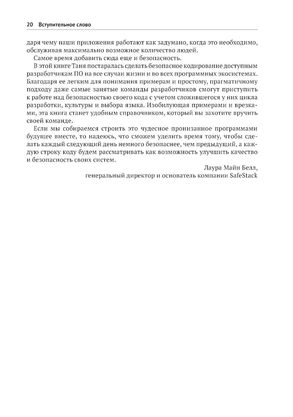 В этой книге, предлагающей принципиально новый подход к безопасной разработке кода, вы найдете полезные аналогии, истории из жизни вымышленных персонажей Алисы и Боба, примеры реальных ситуаций, технические объяснения и диаграммы, благодаря которым запутанные идеи и понятия безопасности приобретают легко усваиваемую форму, позволяющую начать применять их немедленно. Научитесь создавать безопасный код на таких популярных языках, как Python, Java, JavaScript и других. Получите опыт защиты таких каркасов, как Angular, .Net и React. Раскройте секреты борьбы с уязвимостями, основанные на заботе о безопасности своего кода с самого начала! Краткое содержание книги: - безопасное кодирование на Python, Java, Javascript, C/C++, SQL, C#, PHP и других языках; - безопасность в популярных каркасах Angular, Express, React, .Net и Spring; - рекомендации по обеспечению безопасности API, мобильных приложений, веб-сокетов, бессерверных приложений, IоТ-устройств и сетки служб; - основные категории уязвимостей, как они возникают, их риски и способы их избежать; - безопасный жизненный цикл разработки системы; - моделирование угроз, тестирование и анализ кода; - основы создания безопасного кода, применимые к любому языку и каркасу. Издание предназначено для широкой аудитории, включающей разработчиков ПО всех уровней, инженеров по безопасности, архитекторов программ и специалистов в области безопасности приложений. Знакомство с практическими примерами и конкретными приложениями углубит ваше понимание важнейших принципов безопасности и позволит прочно усвоить их.| Издательство | ДМК Пресс |