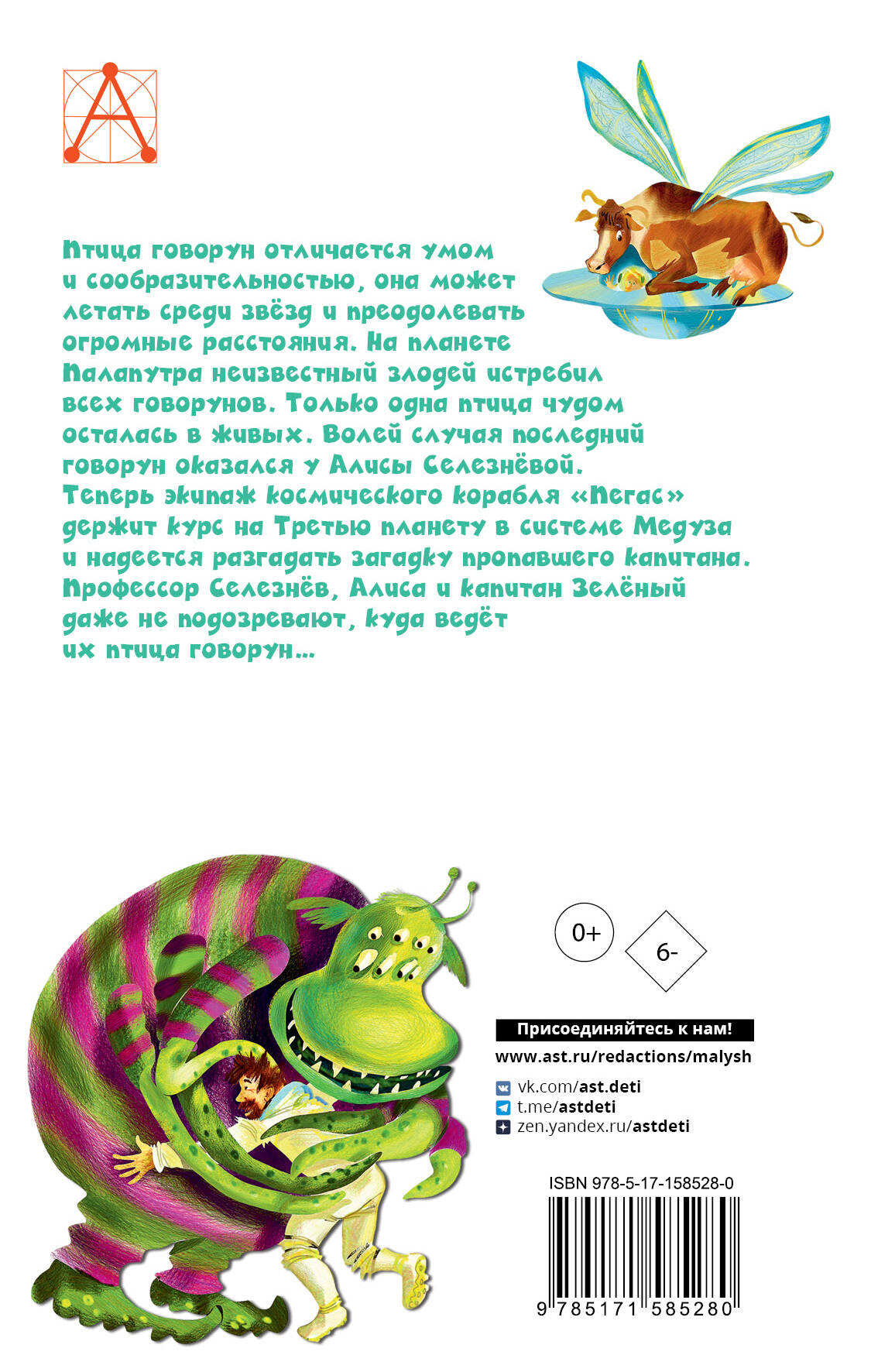 Птица говорун отличается умом и сообразительностью, она может летать среди звёзд и преодолевать огромные расстояния. На планете Палапутра неизвестный злодей истребил всех говорунов. Только одна птица чудом осталась в живых. Волей случая последний говорун оказался у Алисы Селезнёвой. Теперь экипаж космического корабля «Пегас» держит курс на Третью планету в системе Медуза и надеется разгадать загадку пропавшего капитана. Профессор Селезнёв, Алиса и капитан Зелёный даже не подозревают, куда ведёт их птица говорун…| Издательство | ИЗДАТЕЛЬСТВО "АСТ" |