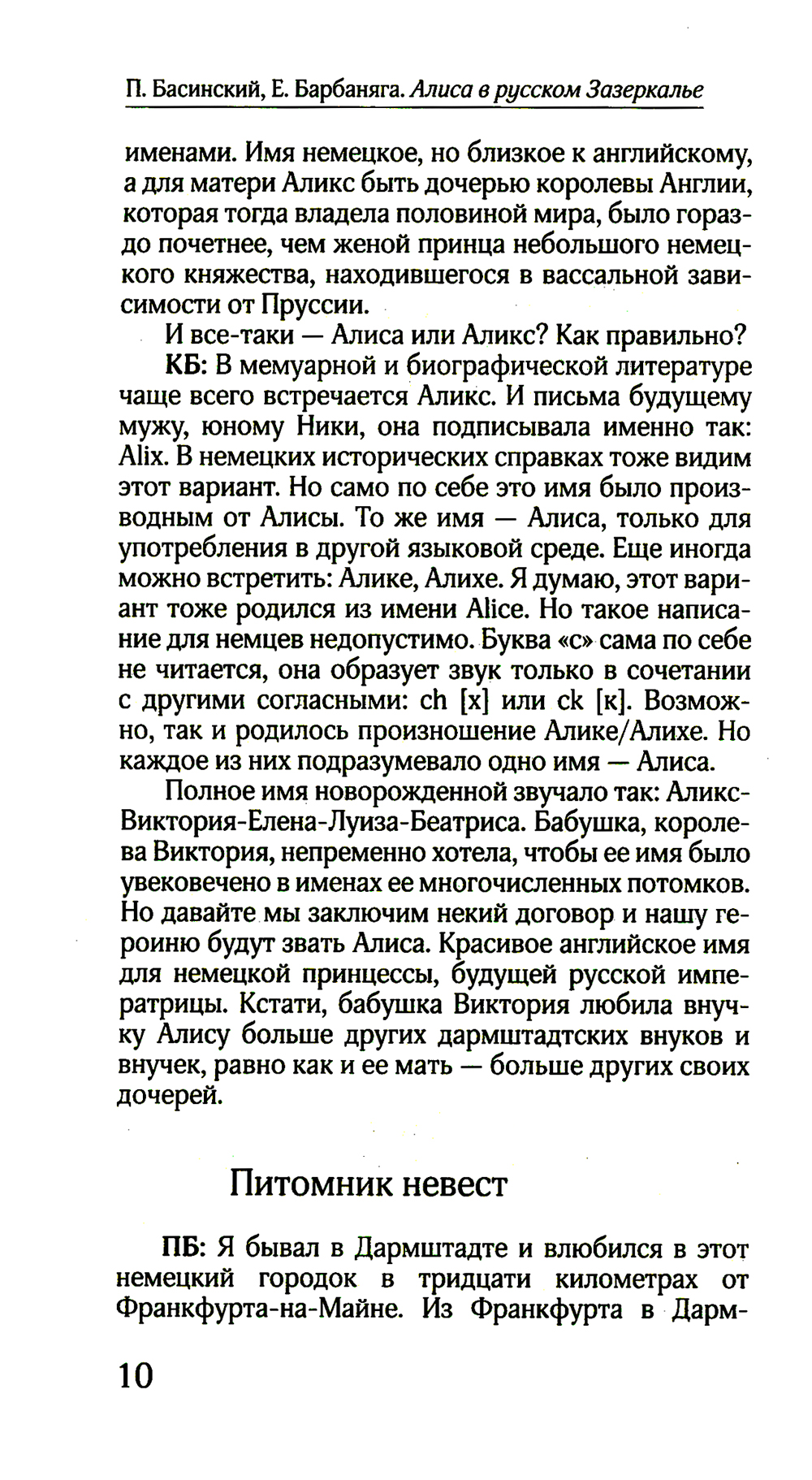 Казалось бы, личность последней русской императрицы - Александры Федоровны, жены царя Николая II, урожденной немецкой принцессы Алисы Гессен-Дармштадтской (1872-1918), - хорошо изучена историками. Однако образ ее в разных описаниях варьируется - от демонического до святого (вместе с другими казненными членами царской семьи Александра Федоровна канонизирована Русской Православной Церковью). Посвященные ей биографические книги порой противоречат не только в оценках, но даже в фактах. Мало кто ставил перед собой задачу представить живой человеческий образ последней русской императрицы - женщины с очень непростой и трагической судьбой. Писатель и журналист, лауреат премии «Большая книга» Павел Басинский и поэт и прозаик из Санкт-Петербурга Екатерина Барбаняга выбрали для своего повествования необычную форму - романа-диалога. И в центре его приключения гессенской принцессы - Алисы, заблудившейся в русском Зазеркалье.| Издательство | Молодая гвардия |