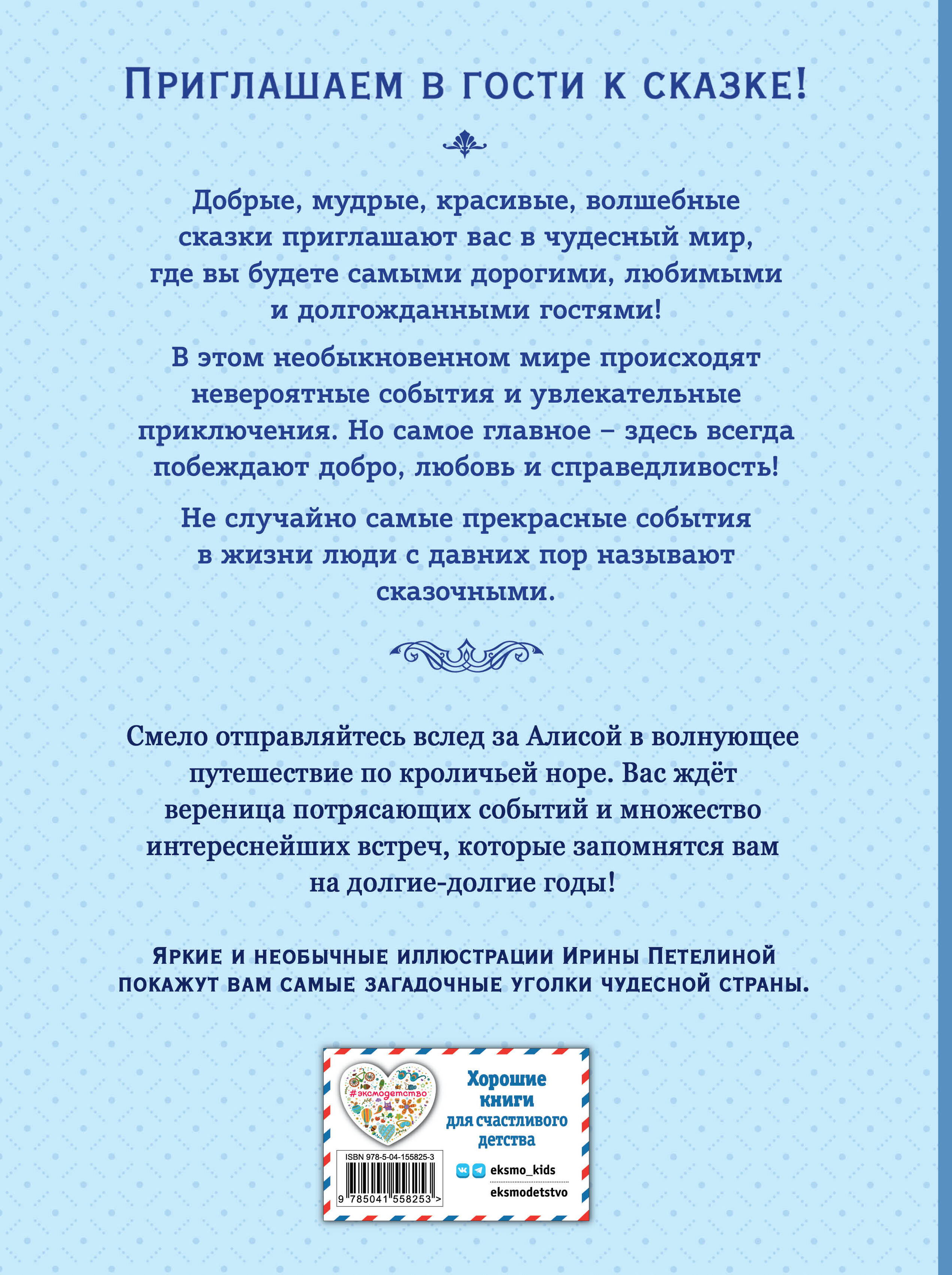Подарочное издание. Большой формат. Твёрдый переплёт с выпуклыми элементами и частичным лаком. Цветные форзацы. Белая бумага. Четкий, крупный шрифт. Полноцветные иллюстрации. Самые популярные волшебные истории в красочном, запоминающемся оформлении - это чудесный подарок юным читателям на все случаи жизни! С книгами серии «В гостях у сказки» к вам приходят чудеса и приключения, мудрые советы, добрые пожелания и яркие иллюстрации. Вам стоит только захотеть - и этот чудесный мир останется с вами навсегда. Необыкновенные приключения, завораживающая игра слов, забавные существа и странные события - всё смешалось в знаменитой сказке Льюиса Кэрролла, заставляя нас удивляться, смеяться и вновь перечитывать полюбившиеся строки. А финал книги, предсказывающий будущее главной героини, звучит как доброе пожелание каждому читателю: «У неё будет доброе и любящее сердце - такое же, как и теперь. Она так же станет собирать вокруг себя детей и… всегда будет сочувствовать их детским горестям и разделять с ними радости». Полный классический перевод Александры Рождественской. Выразительные и точные иллюстрации Ирины Петелиной.| Издательство | ООО "Издательство "Эксмо" |