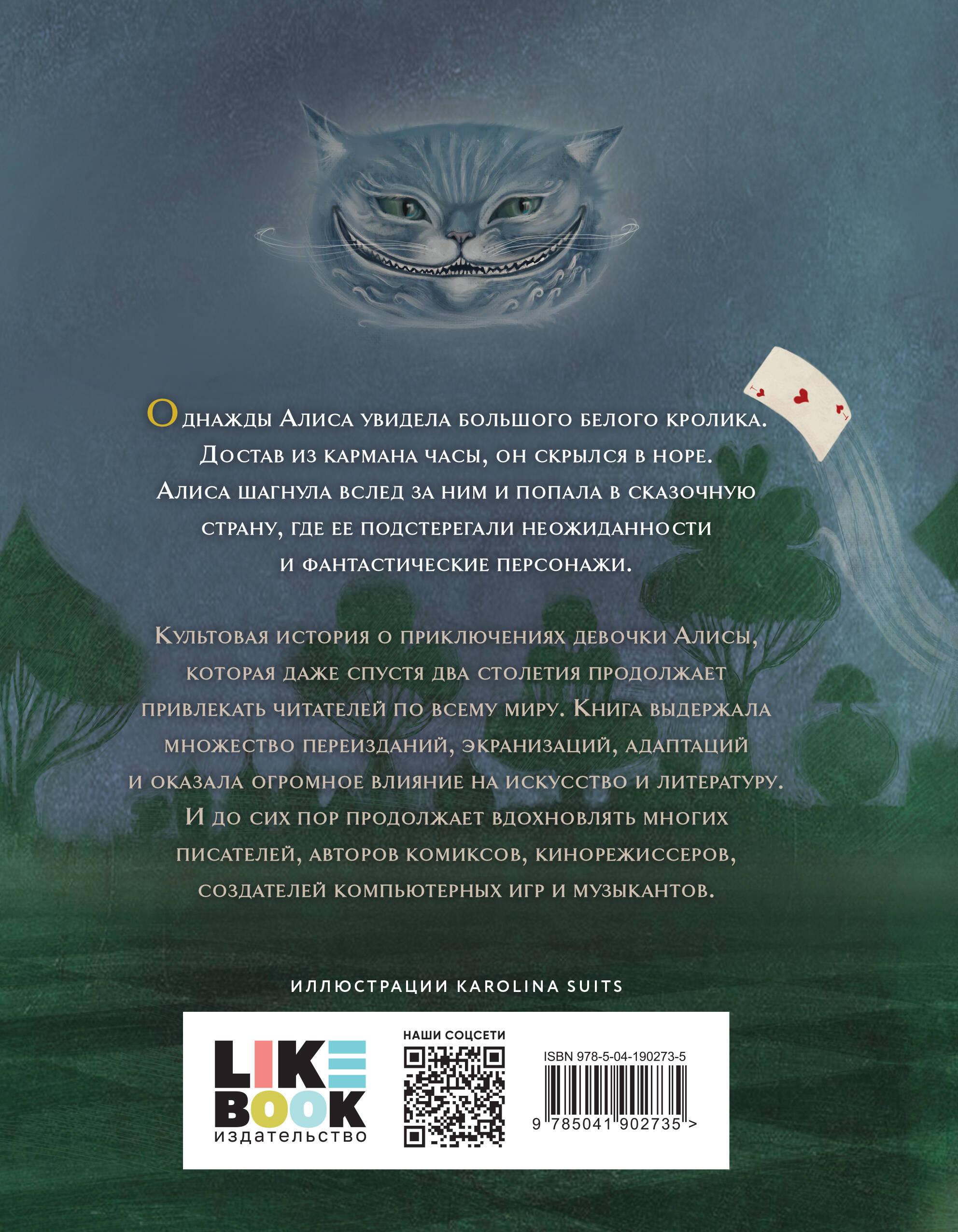 Мировой бестселлер! Миллионы проданных экземпляров по всему миру! «Алиса в Стране чудес» - шедевр и культовая история, которая даже спустя два столетия продолжает привлекать читателей. Однажды Алиса увидела большого белого кролика. Достав из кармана часы, он скрылся в норе. Алиса шагнула вслед за ним и попала в сказочную страну, где ее подстерегали неожиданности и фантастические персонажи. Книга выдержала множество переизданий, экранизаций, адаптаций и оказала огромное влияние на искусство и литературу. И до сих пор продолжает вдохновлять многих писателей, авторов комиксов, кинорежиссеров, создателей компьютерных игр и музыкантов. Иллюстрации на обложку и для блока этого издания нарисовала талантливая и популярная художница Karolina Suits.