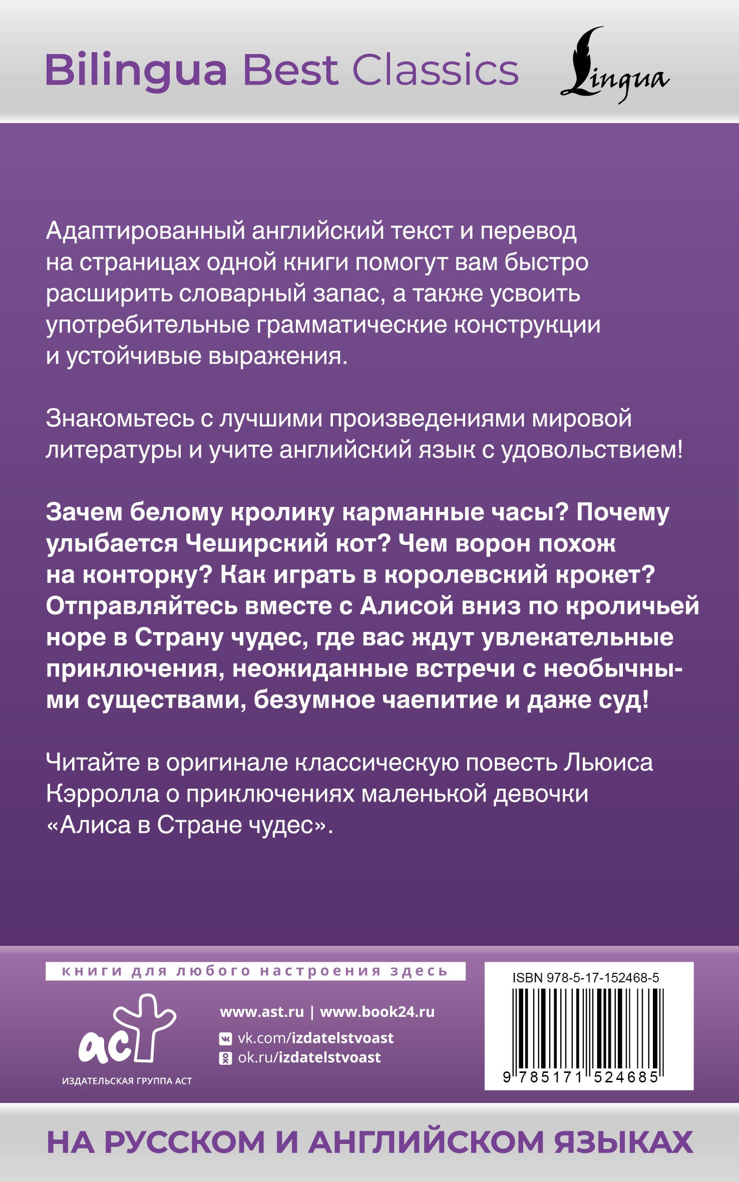 Зачем белому кролику карманные часы? Почему улыбается Чеширский кот? Чем ворон похож на конторку? Как играть в королевский крокет? Отправляйтесь вместе с Алисой вниз по кроличьей норе в Страну чудес, где вас ждут увлекательные приключения, неожиданные встречи с необычными существами, безумное чаепитие и даже суд! Читайте в оригинале классическую повесть Льюиса Кэрролла о приключениях маленькой девочки "Алиса в Стране чудес". Адаптированный английский текст и перевод на страницах одной книги помогут легко познакомиться с лучшими произведениями мировой литературы и выучить английский язык с удовольствием. Благодаря параллельным текстам вы быстро расширите свой словарный запас, а также усвоите употребительные грамматические конструкции и устойчивые выражения. Издание адресовано всем, кто хочет совершенствовать свои знания и читать литературу на языке оригинала.| Издательство | ИЗДАТЕЛЬСТВО "АСТ" |