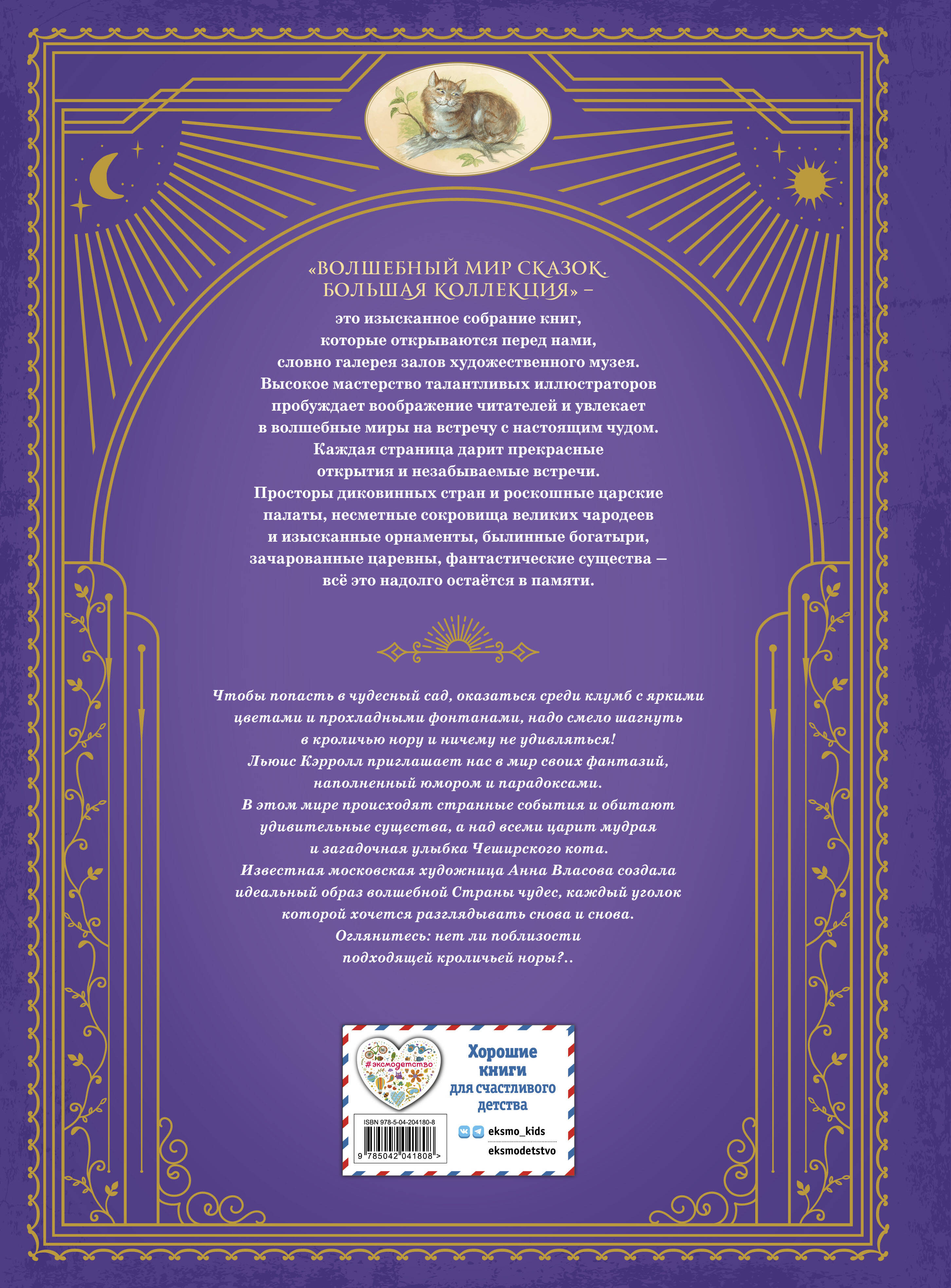 ВЕЛИКОЛЕПНОЕ ПОДАРОЧНОЕ ИЗДАНИЕ В ИЗЫСКАННОМ И СТИЛЬНОМ ОФОРМЛЕНИИ! Книга большого формата (24х32,5 см). Твёрдый переплёт с золотым тиснением и частичным лаком. Цветные форзацы. Плотная бумага. Чёткий, удобный для чтения шрифт. Красочные иллюстрации. Книги серии «Волшебный мир сказок. Большая коллекция» - это приглашение в удивительное путешествие по таинственным мирам, ставшим зримыми и осязаемыми благодаря искусству художников. Лучшие мастера книжной иллюстрации подарят вам незабываемые впечатления от встречи со сказкой. Знаменитая сказка английского математика, писателя и поэта Льюиса Кэрролла «Алиса в Стране чудес» - один из мировых супербестселлеров, сохраняющий свою популярность больше полутора столетий! Историю невероятных приключений любознательной и здравомыслящей Алисы в чудесном мире можно читать в любом возрасте. Юные читатели с восторгом встречают забавных персонажей: Грифона, Черевродепаху, Безумного Шляпника, Чеширского кота. Взрослые с удовольствием погружаются в замысловатую игру слов. Классический перевод Александры Рождественской и выразительные, детальные иллюстрации Анны Власовой сделают эту книгу прекрасным подарком к любому празднику. С незапамятных времён люди придумывали необыкновенные страны, населяли их чудесными существами и рассказывали диковинные истории об удивительных событиях, происходивших «в некотором царстве, в некотором государстве». Так появились сказки, без которых сегодня мы не можем представить детство. Волшебные или очень похожие на правду, страшные или смешные, народные или литературные - все они увлекали слушателей своей необычностью, загадочностью, передавали от предков и закладывали в сердца бесценные сокровища: вековую мудрость, понимание добра и зла, неписаные правила жизни, - и так формировали уникальный культурный код наций и народов.| Издательство | ООО "Издательство "Эксмо" |