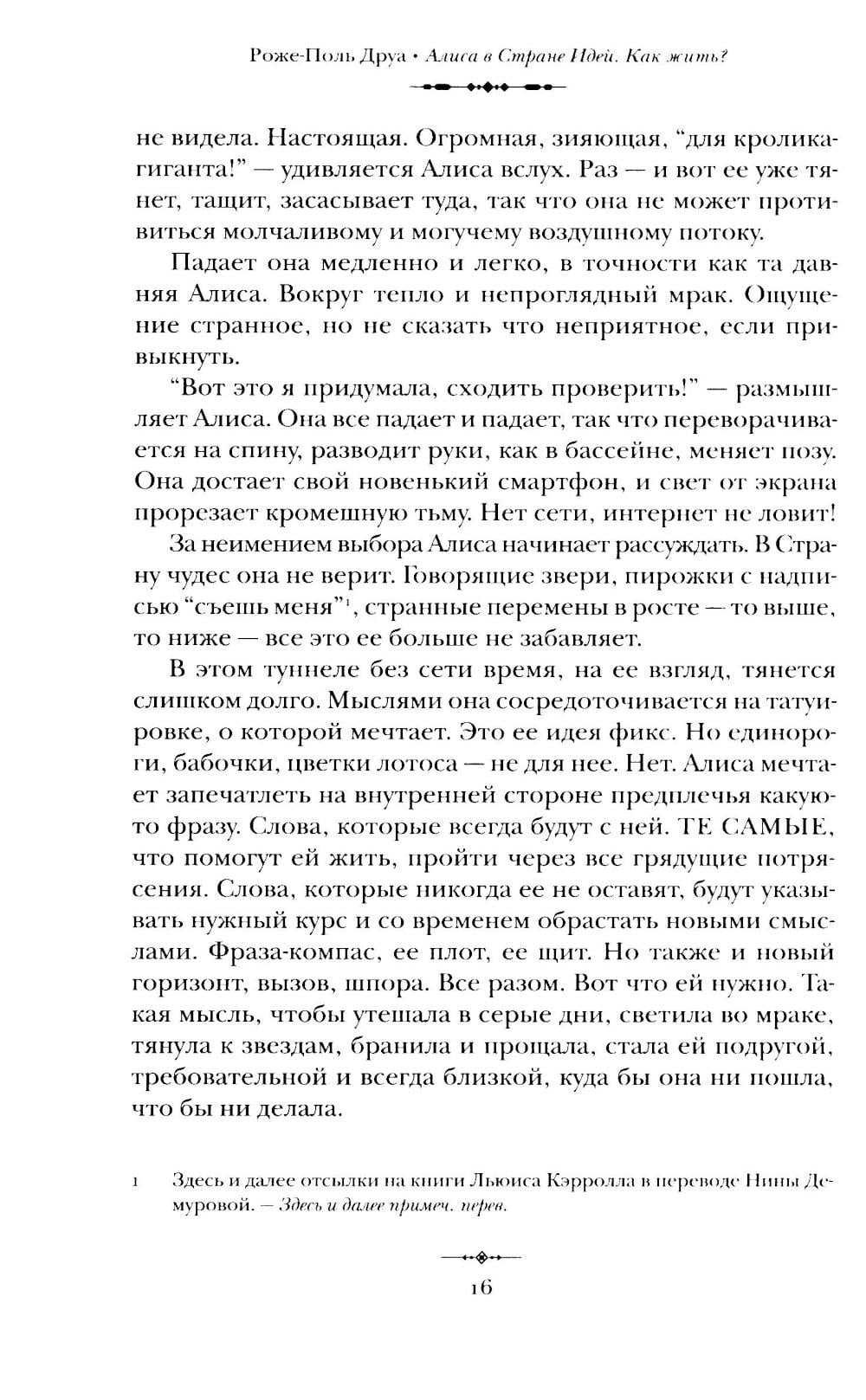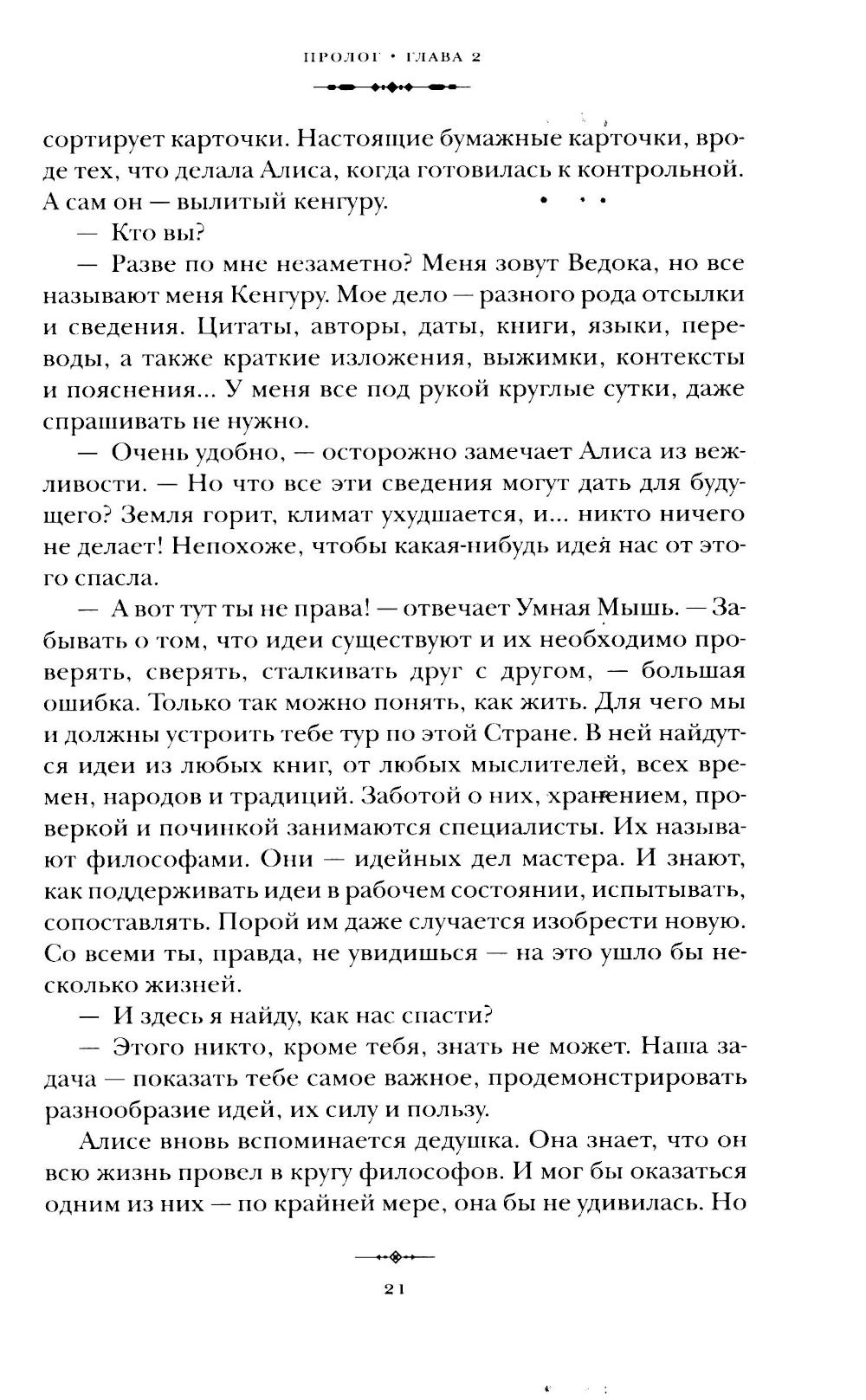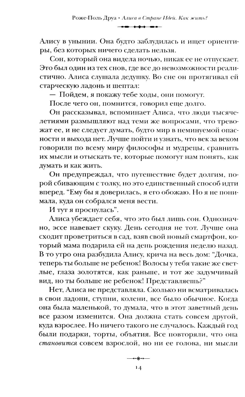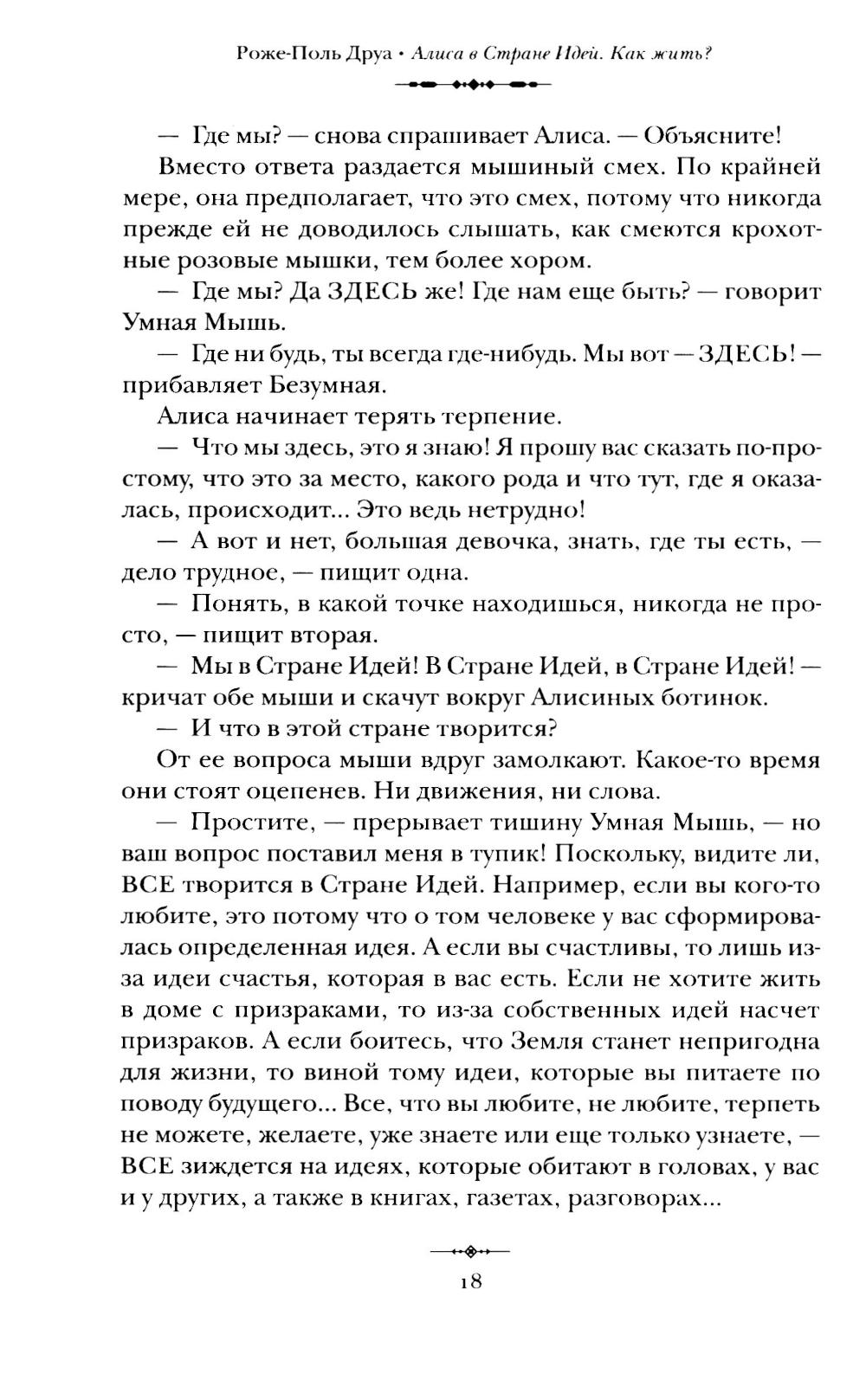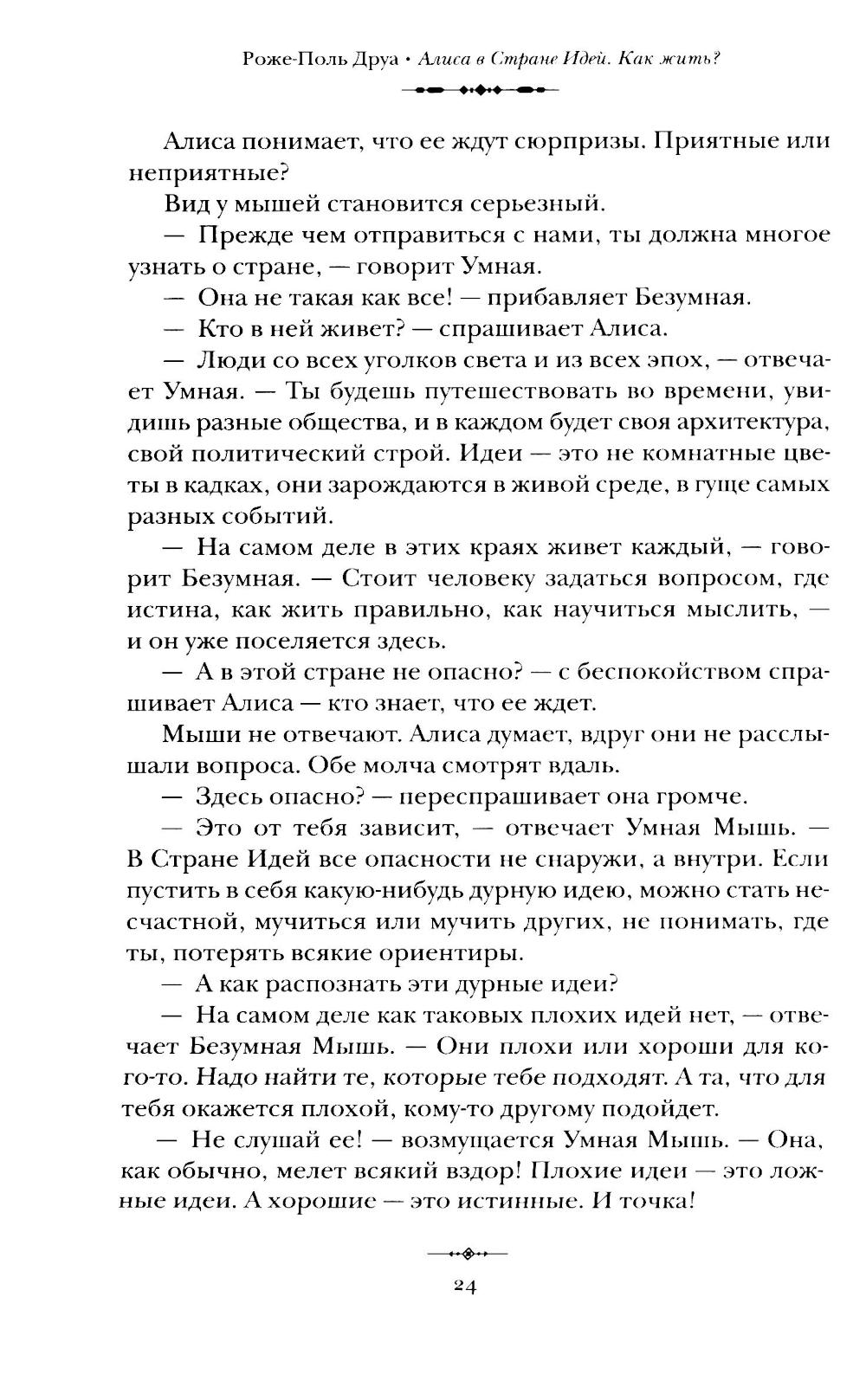 Что получится, если героиня «Алисы в Стране чудес» вдруг окажется не среди говорящих кроликов и безумных чаепитий, а в мире философских идей? Если вместо игривых созданий она будет встречаться с Платоном, Декартом, Кантом и Ницше? Французский философ и писатель Роже-Поль Друа предлагает отправиться в необычное путешествие по «Стране Идей», где Алиса - не просто любопытная девочка, а настоящий исследователь смысла, логики и истины. Как жить? Зачем жить? Чему верить? Юную Алису одолевают вопросы, и она мечтает найти один всеобъемлющий ответ - истину, которой она будет руководствоваться в жизни, а может, и вытатуирует на руке. Истину, что станет для нее путеводной звездой. Но для этого нужно разобраться во множестве философских и этических идей, которые человечество сумело накопить и успело сформулировать за свою долгую историю. Ей предстоят встречи с мудрецами и философами - возможно, они помогут разобраться в сумятице мира, в котором она живет, объяснят, как следует жить? Полный иронии, теплого юмора, познавательный роман-путешествие по самым главным философским идеям.| Издательство | Фантом Пресс |