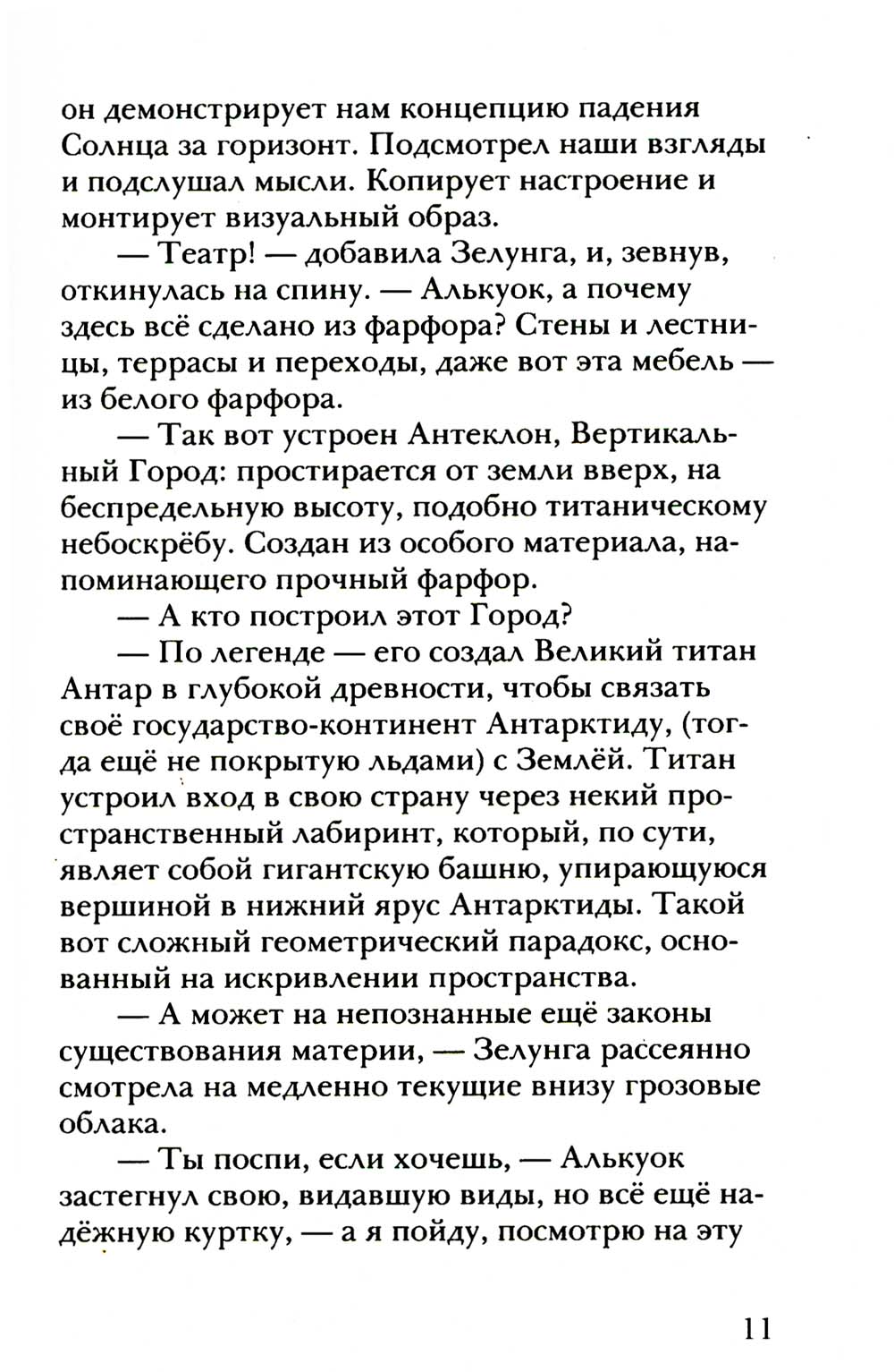 Загадочный человек Алькуок совершает путешествие в удивительный вертикальный город Антеклон, где хозяйничает невидимый и ужасный Оренаду. Вместе с друзьями, Алькуок попадает в запутанные ситуации, из которых, кажется, нет выхода. Появляются ужасающие существа и происходят странные события. Кажется, что человеческий разум не в состоянии справиться с таинственными задачами и выясняется, что мы почти ничего не знаем о нашем Мире.| Издательство | ИПЛ |
