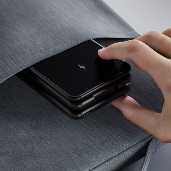 Allity AWC-230-22WMS - складная компактная беспроводная зарядная станция 3‑в‑1, предназначенная для iPhone (с MagSafe), Apple Watch и AirPods. Предлагает удобную вертикальную подставку для телефона с регулируемым углом наклона, прочный металлический корпус в графитовом цвете и минималистический дизайн.