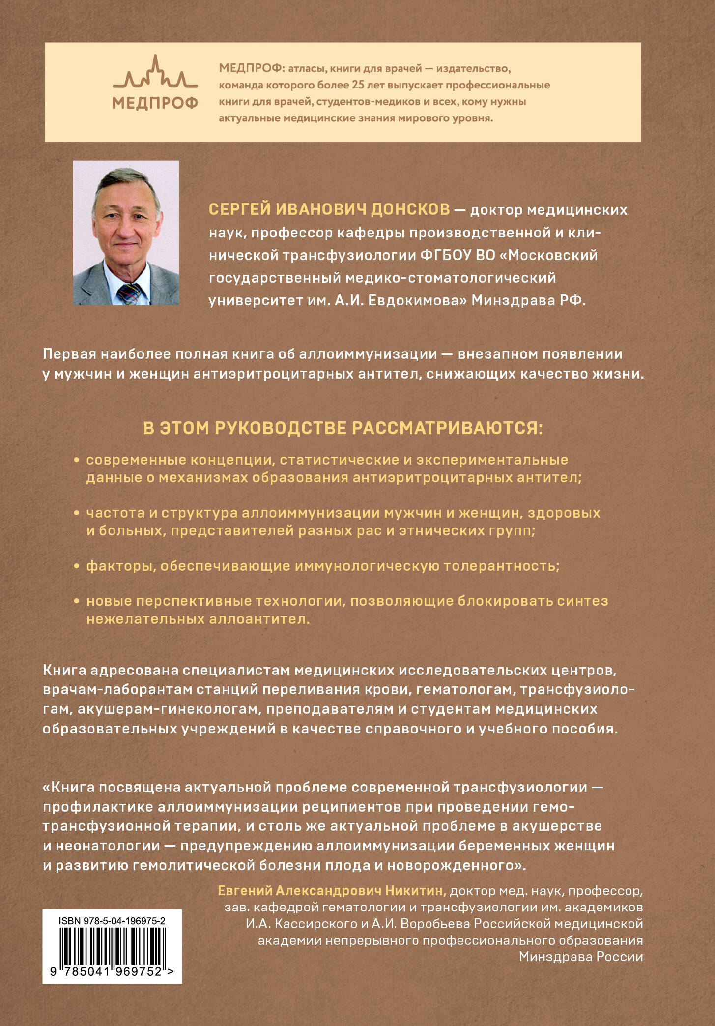 До сих пор в медицинской литературе не было всеобъемлющей книги об аллоиммунизации в трансфузиологии, рассматривающей современные концепции, частоту и структуру аллоиммунизации мужчин и женщин, доноров и больных разного возраста, представителей разных рас и этнических групп. В то же время эта информация представляет научный интерес и имеет практическое значение для широкого круга врачей. Автор книги Сергей Иванович Донсков, профессор, доктор медицинских наук, пользуется непререкаемым авторитетом в медицинском сообществе. Профессор Донсков обсуждает данные о динамике показателей аллоиммунизации больных и беременных в различных регионах России и рассматривает мероприятия по повышению качества гемотрансфузионной терапии и профилактики желтухи новорожденных. Книга будет востребована в качестве справочного и учебного пособия широким кругом научных и практических специалистов: в профильных медицинских исследовательских центрах, врачами-лаборантами станций и отделений переливания крови, гематологами, трансфузиологами, акушерами-гинекологами, преподавателями медакадемий, слушателями курсов повышения квалификации врачей, судебными медиками, антропологами, организаторами здравоохранения, а также студентами медвузов и колледжей.